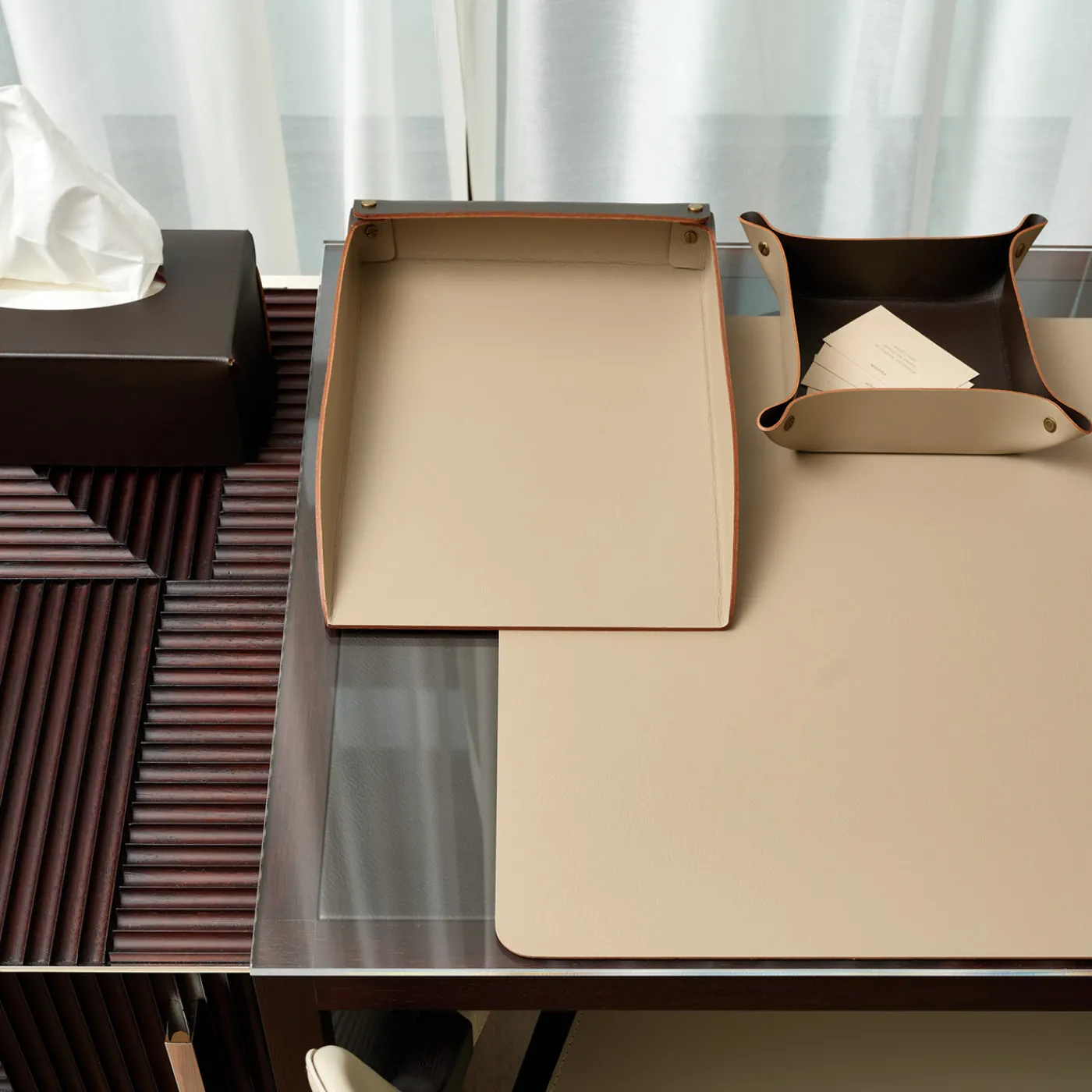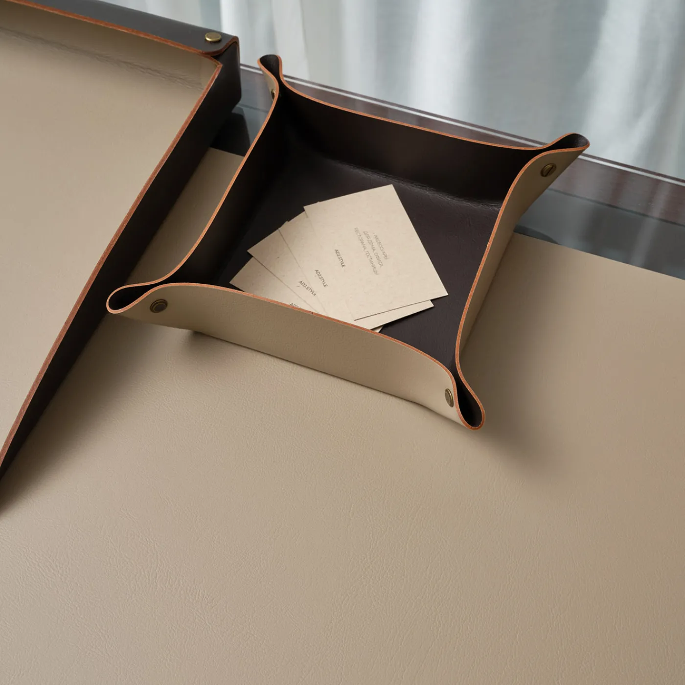 Un vide poche pratico e funzionale, pensato per tenere in ordine e a portata di mano piccoli oggetti come graffette, monete e chiavi sulla scrivania. Questo accessorio presenta un rivestimento esterno color Cappuccino abbinato a un interno in tonalità Chocolate, con angoli fissati da bottoni a pressione che aggiungono un dettaglio discreto alle sue linee essenziali. Disegnato da Ekaterina Borovkova, coniuga stile e utilità per un uso quotidiano comodo ed elegante.