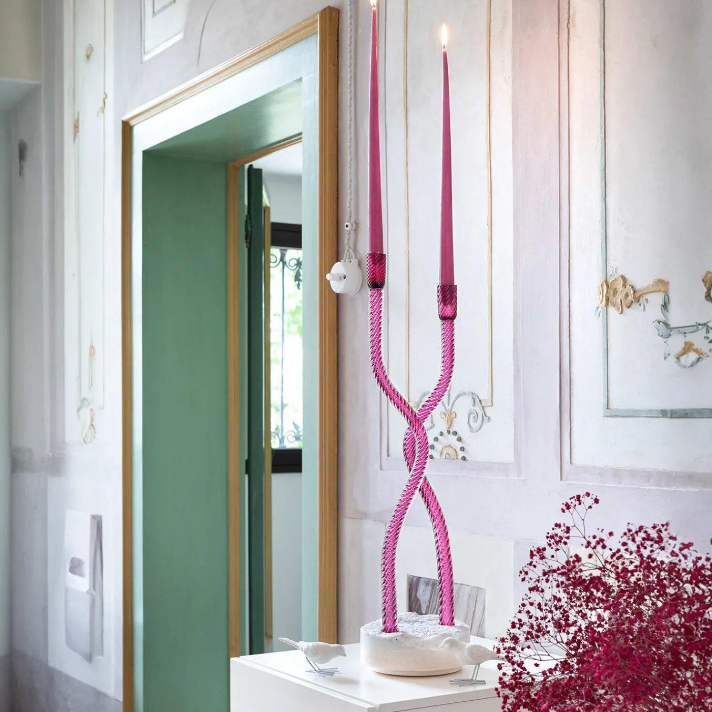 Vetro di Murano soffiato a bocca in un doppio portacandele ritorto per un pezzo unico di design italiano, funzionale e modulare. La silenziosa monumentalità dei marmi abbraccia luminosamente la fragilità e l’eleganza dei manufatti in vetro di Murano. Pietra lavorata a mano, il marmo Palissandro è una pietra di straordinaria bellezza. La sua materia purissima è punteggiata da minuscoli cristalli luminosi. Le candele non sono incluse.