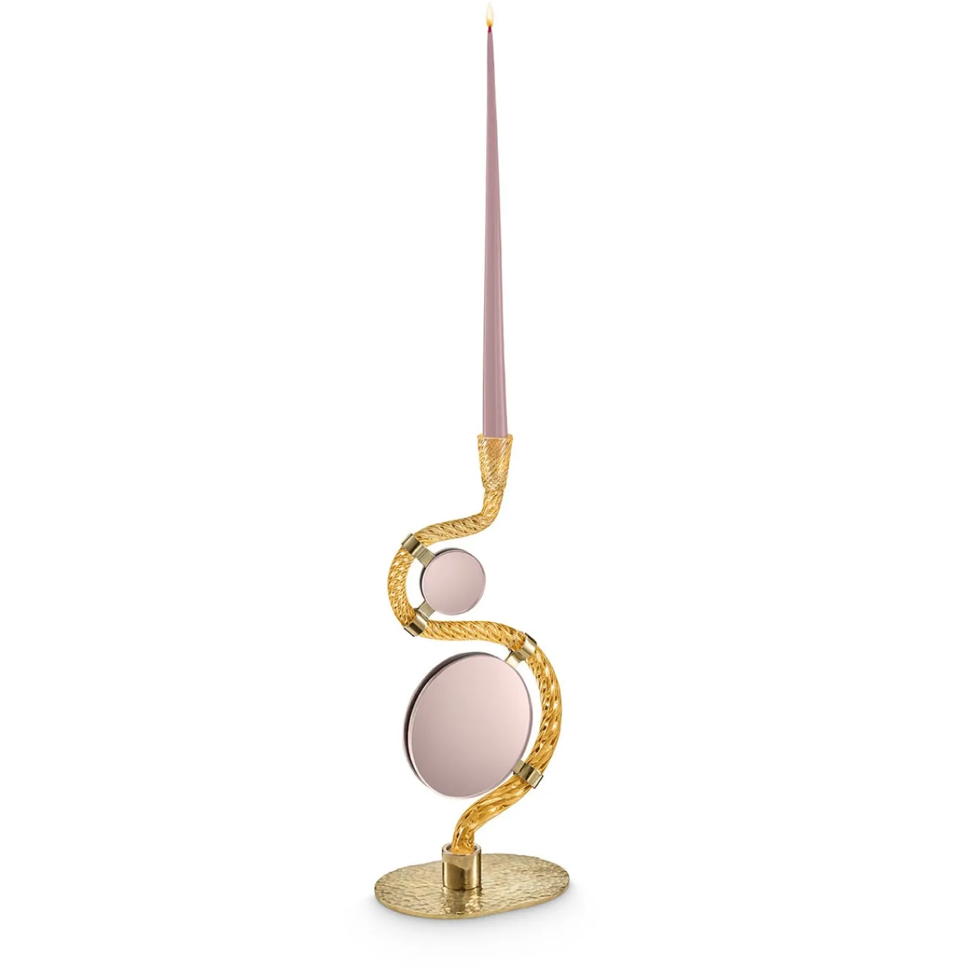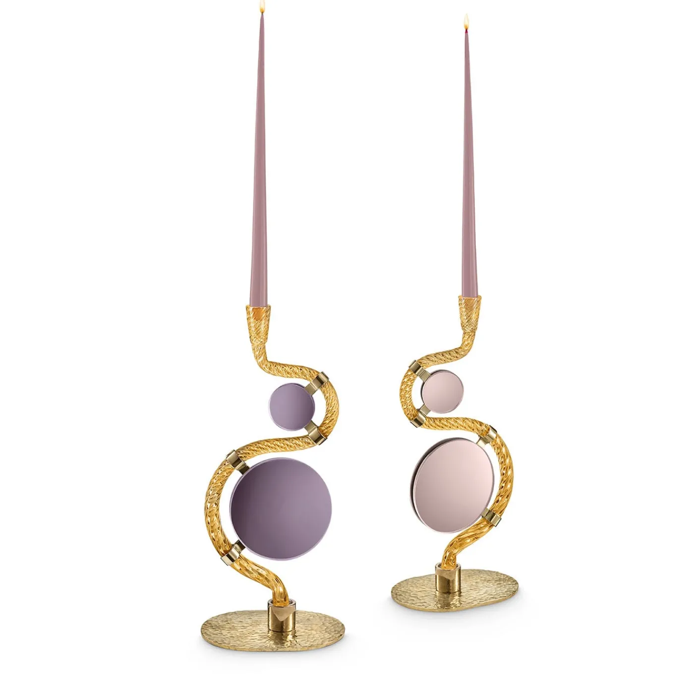 Gli specchi verticali e il candelabro in vetro di Murano oro di questa collezione rappresentano il profondo legame di Aina Kari con il patrimonio veneziano e il design significativo. Il sinuoso vetro dorato soffiato a bocca, con i suoi quattro “ponti” in ottone martellato, evoca la bellezza del Canal Grande e dei suoi iconici ponti. La combinazione di vetro di Murano e specchi colorati di Giovanni Botticelli cattura e rifrange la luce, fondendo la tradizione con l’artigianato moderno. La candela inclusa è bianca. I due specchi sono bifacciali, di colore viola e rosa.