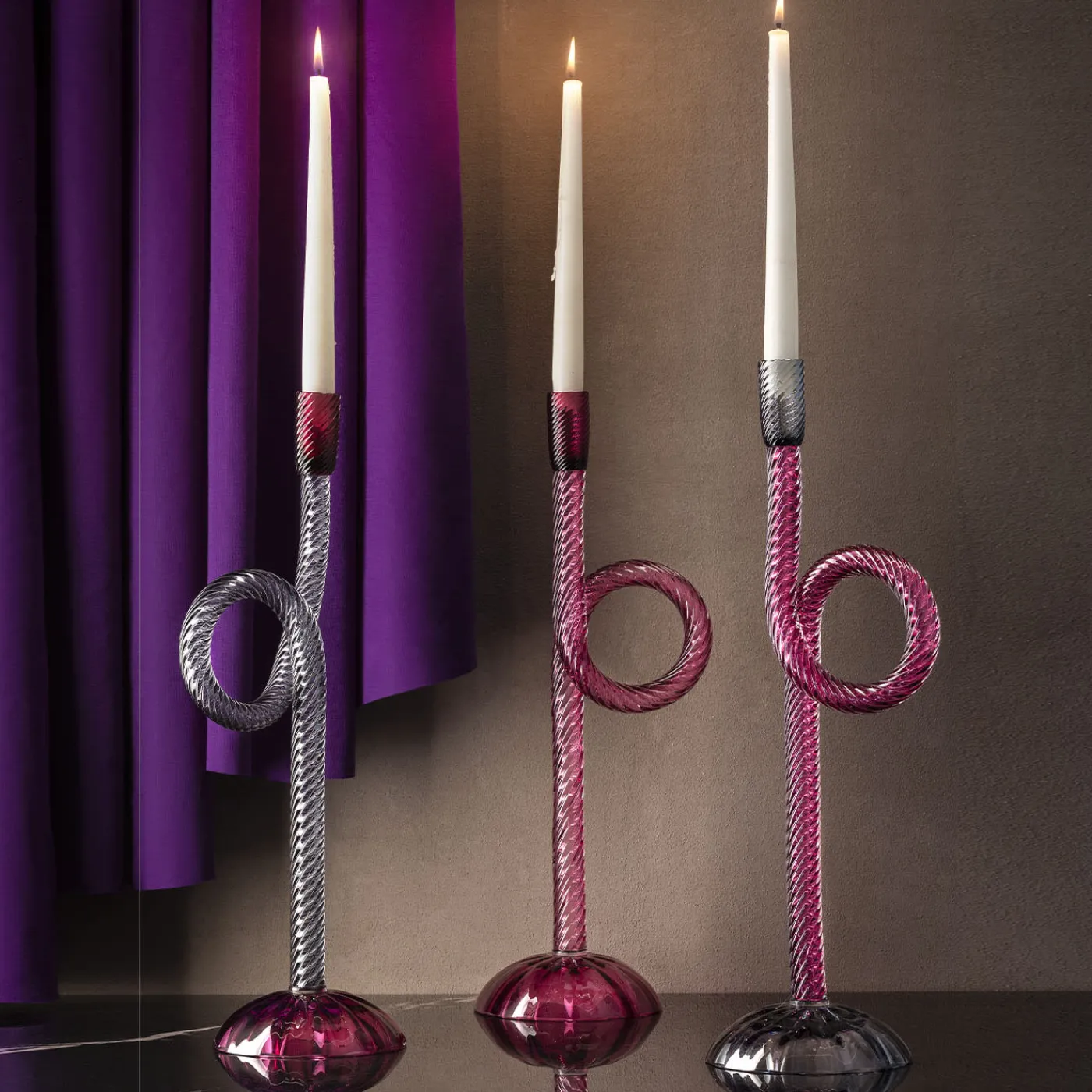 Utilizzando varie tecniche, come l’aggiunta di minerali e ossidi al vetro fuso per ottenere un ampio spettro di tonalità, l’uso del colore nel vetro di Murano permette agli artisti di creare motivi intricati, forme delicate e disegni inaspettati, rendendo ogni pezzo unico. A differenza di altri colori del vetro, il colore del vetro rubino è dato dall’aggiunta di oro 24 kt nel vetro fuso. Questa originale collezione di portacandele è una dimostrazione fisica di quanto possa essere complessa la produzione del vetro di Murano.