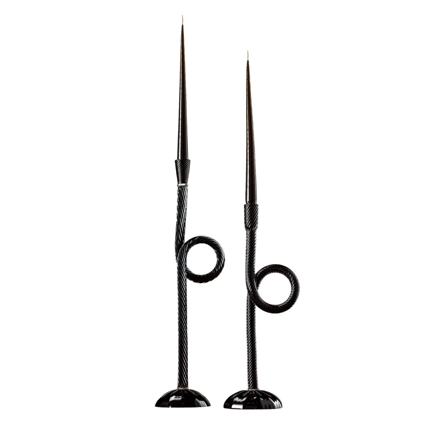 Set di 2 candelabri in vetro di Murano che presentano una silhouette distintiva a nodo veneziano con forme elegantemente curve e delicatamente testurizzate. Soffiati a bocca secondo standard rigorosi, il design scultoreo offre un’interazione poetica di altezze a 45 cm e 55 cm. Questi candelabri sinuosi introducono ritmo e raffinatezza ai tavoli da pranzo o ai supporti con il loro dinamico senso di movimento e leggerezza. Le candele sono incluse.