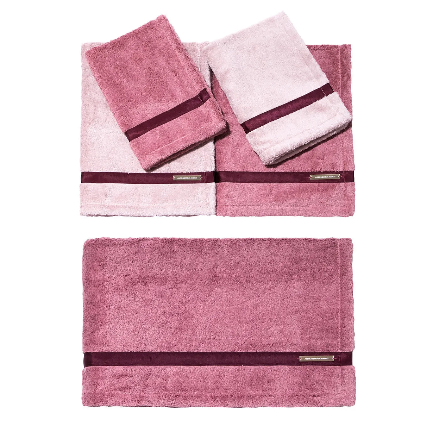 Questo elegante set di asciugamani da bagno è completo di 2 asciugamani piccoli, 2 medi e uno grande nei colori rosa cipria e rosa antico. 100% morbido cotone egiziano con bordi cuciti a mano, arricchiti da nastri bordeaux. La targhetta metallica con il logo è stata impressa e presenta una finitura in oro 18 carati.