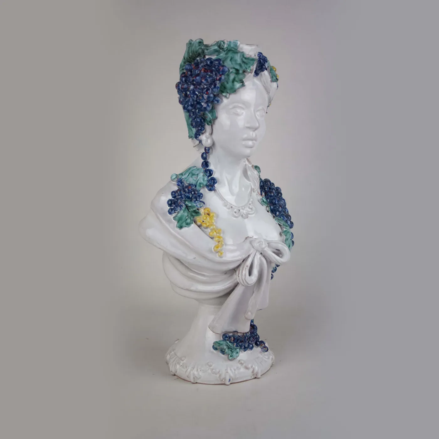 L’autunno è in corso in questa bellissima scultura busto in ceramica bianca smaltata che ritrae una donna, i cui lineamenti sono quelli dei Mori della Sicilia del passato e la cui testa e le cui spalle sono ricoperte di uva blu matura, pronta per essere trasformata in vino. Tutti i dettagli sono rifiniti a mano per un pezzo unico e straordinario.