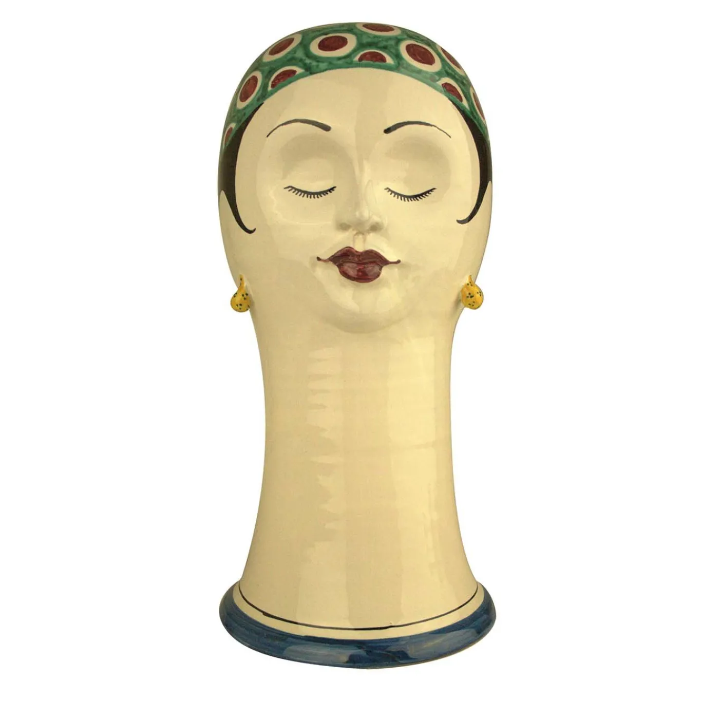 Questa splendida scultura di Alessandro Iudici fa parte di una serie di figure dal collo allungato rese ad arte in ceramica, lavorate al tornio e poi rifinite e dipinte a mano. Il titolo di questo squisito manufatto è “Nuotatrice”, contraddistinto dalla cuffia da nuotatore. I suoi lineamenti raffinati, il suo sorriso ipnotico e i suoi orecchini delicati creano un’immagine onirica che fungerà da accento poetico per un interno moderno o eclettico. Da sola o abbinata ad altri pezzi simili, questa scultura cattura l’attenzione e ipnotizza.