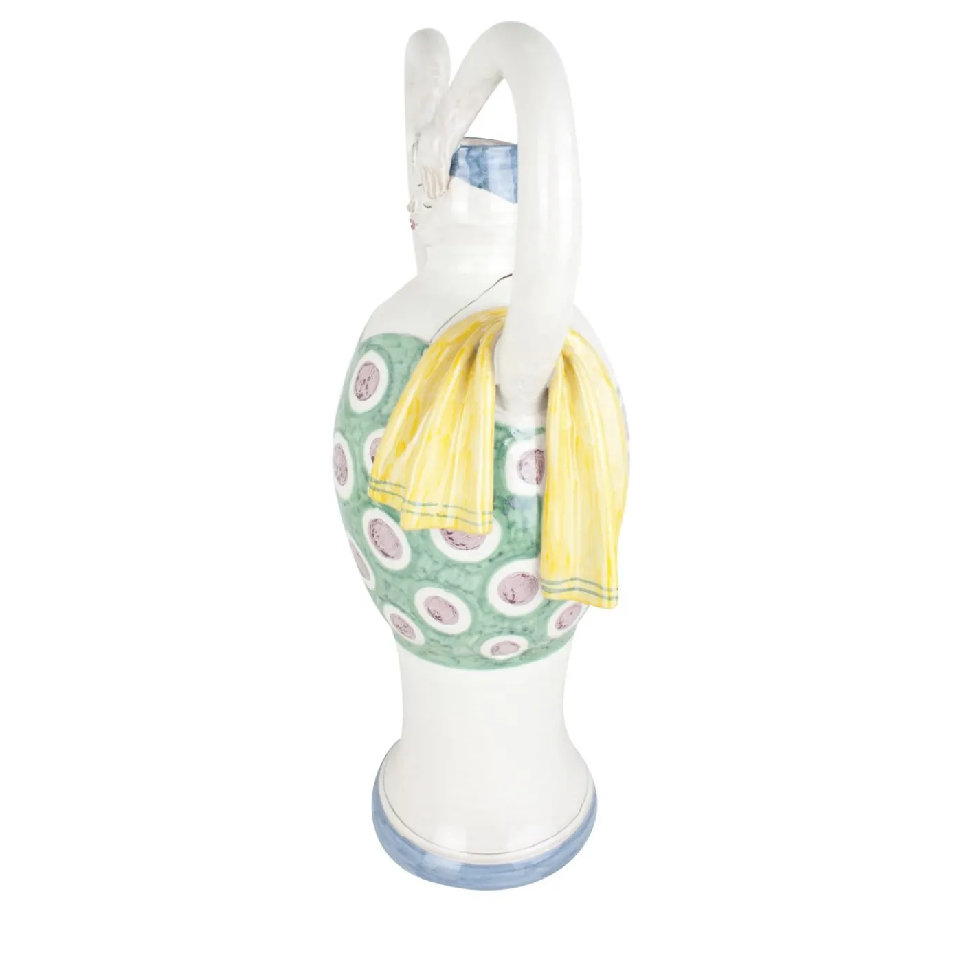 Questa deliziosa opera d’arte funge da vaso che può essere utilizzato per conservare qualsiasi liquido desiderato. L’affascinante forma del vaso riproduce l’aspetto di una nuotatrice pronta a tuffarsi, con le braccia tese sopra la testa che fungono da due manici. La pittura colorata sul costume della nuotatrice è ottenuta con smalti vibranti applicati a mano. La nuotatrice ha anche il suo asciugamano sulle spalle, un dettaglio aggiunto a mano dopo che la forma è stata realizzata al tornio.