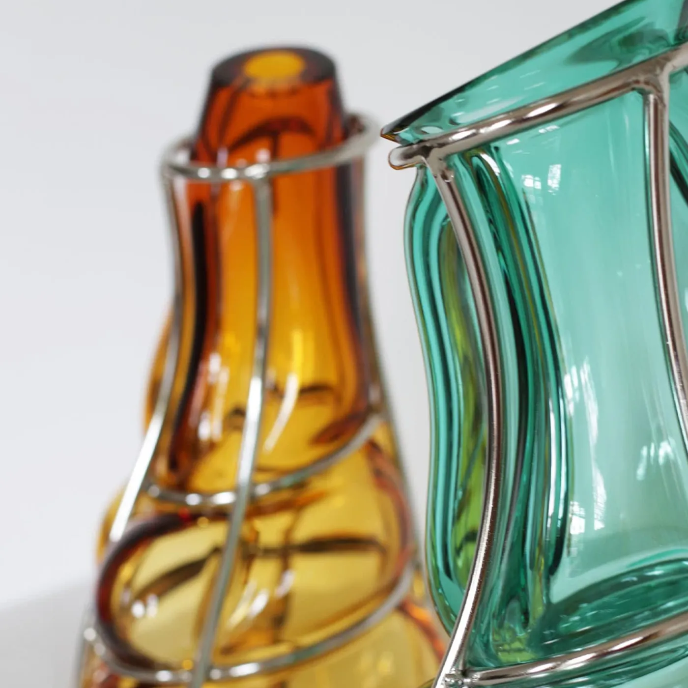 Utilizzando antiche tecniche di lavorazione del metallo e del vetro, ogni vaso Babà è realizzato con precisione, diventando un gioiello artistico per l’arredamento della casa. L’artista piega e salda meticolosamente il metallo, facendo rivivere la tecnica dell’ingabbiato. Collaborando con gli artigiani di Murano, Alice onora il patrimonio italiano con vasi ispirati alle forme umane, celebrando l’individualità. La replica può presentare lievi variazioni dovute a un processo di produzione artigianale. Ogni manufatto è unico: l’altezza, la “pienezza”, il taglio e le sfumature di colore dipendono dal momento esatto in cui il vetro viene soffiato all’interno della gabbia metallica dal Maestro vetraio. Finitura del metallo: nichelato. Bocca: Ø8cm.