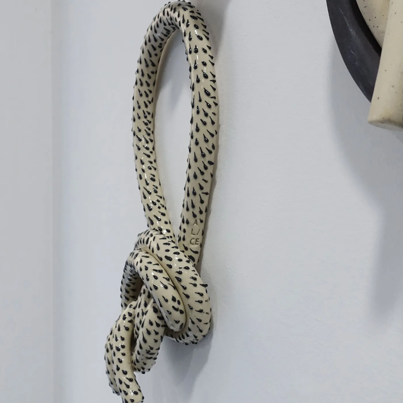 Design unico di raffinatezza senza tempo, questo decoro da parete a forma di nodo appartiene a una serie esclusiva che simboleggia un legame indissolubile. Interamente realizzato a mano in gres porcellanato, è decorato con un motivo a macchie di gocce di porcellana laccata nera, impreziosito da una finitura lucida. Dotato di due piccoli fori sul retro per essere appeso facilmente, può presentare piccole imperfezioni che testimoniano l’unicità del vaso e l’autenticità del materiale.