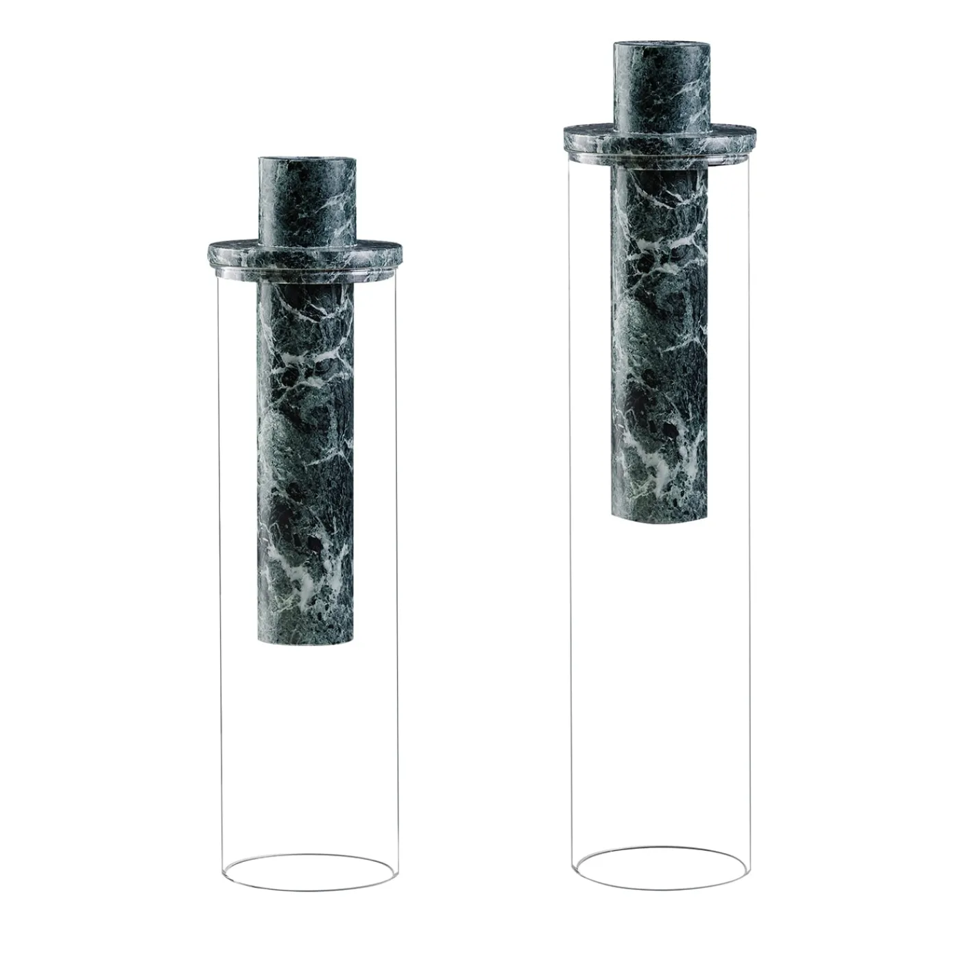 Ricco di fascino scultoreo, questo superbo vaso combina vetro e marmo in un gioco di trasparenze che gli conferisce un accattivante effetto visivo. L’elemento sagomato in marmo Verde Alpi, incastonato nel cilindro di vetro trasparente, appare come apparentemente fluttuante, una giustapposizione di materiali che ne sottolinea il contrasto di peso. Sono disponibili le varianti Rosso Levanto e Limestone Sinai.
