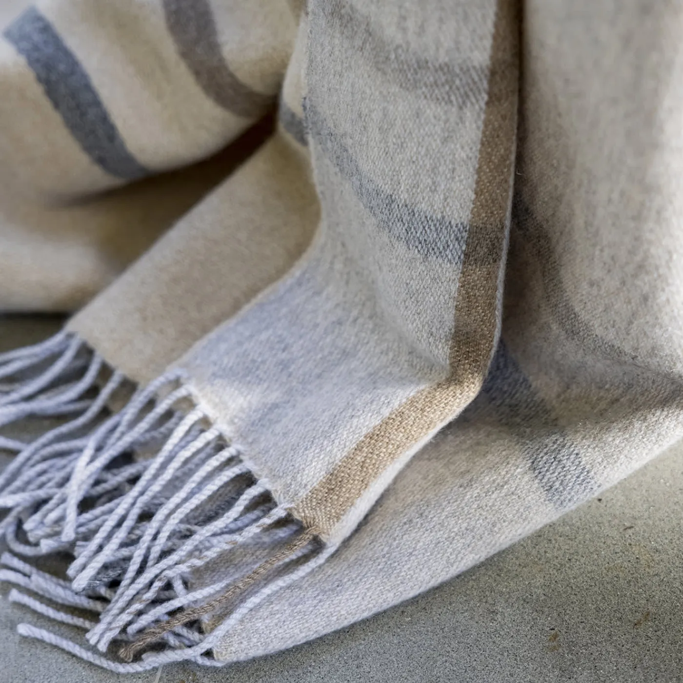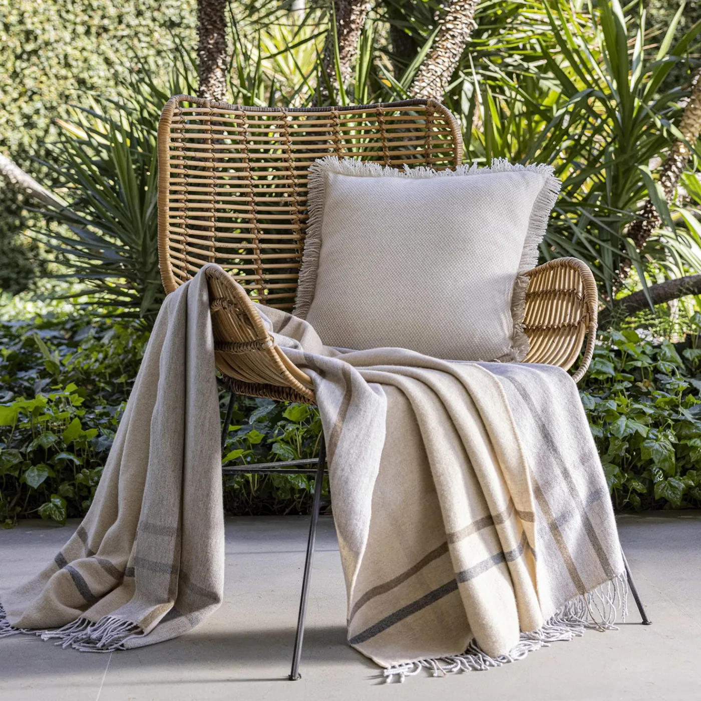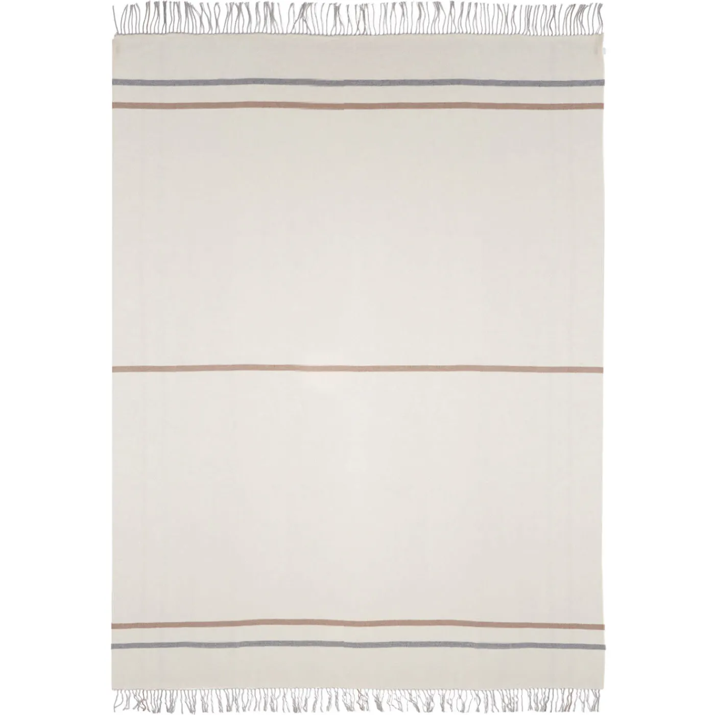 Questa sofisticata coperta di piccole dimensioni ravviva un set da letto o una poltrona con il suo design delicato, dove i dettagli marrone chiaro e azzurro contrastano dolcemente con il resto della trama beige. Raffinata e morbida, è ravvivata da frange che aggiungono un pizzico di freschezza al suo fascino sobrio. Si abbina con facilità ad arredamenti classici e contemporanei.