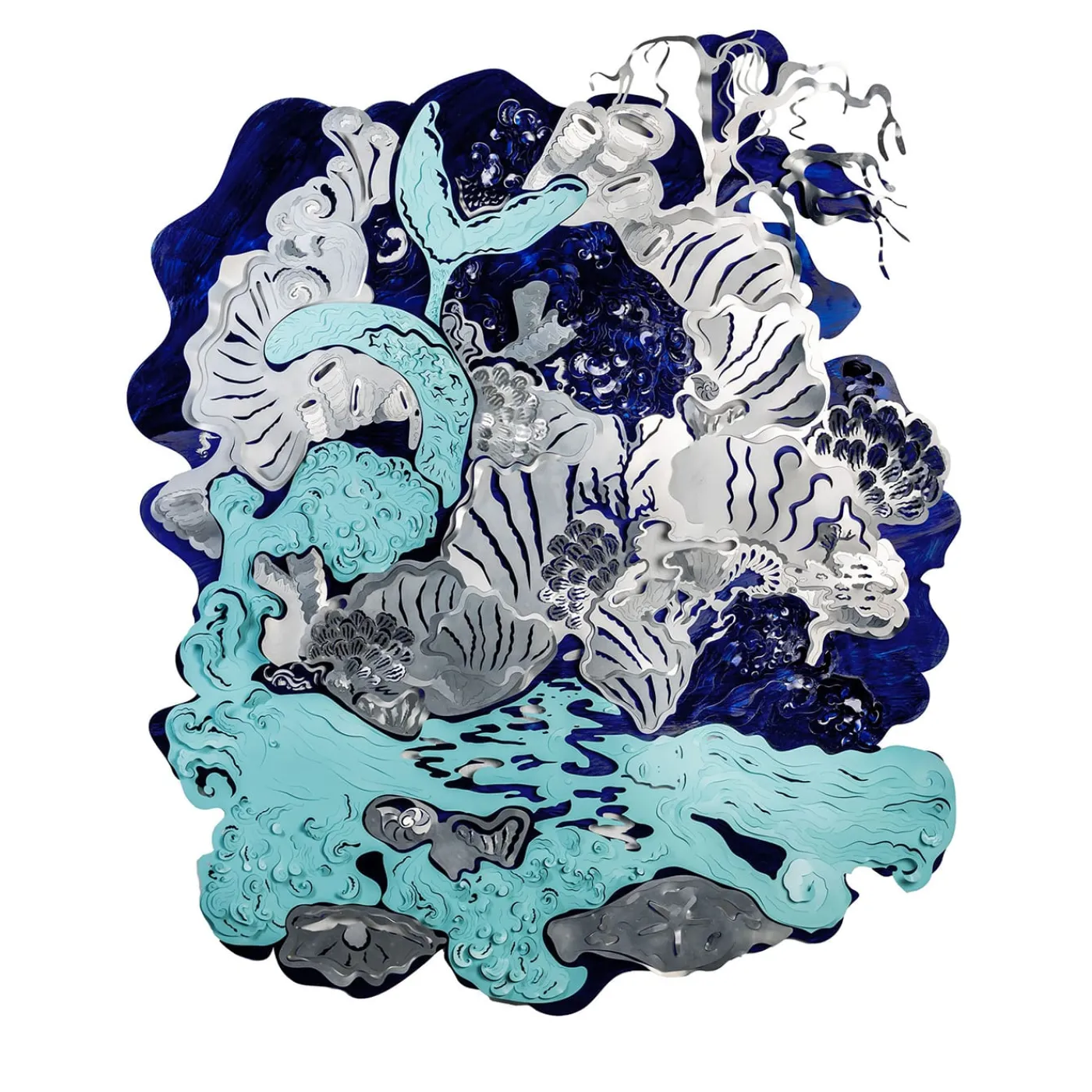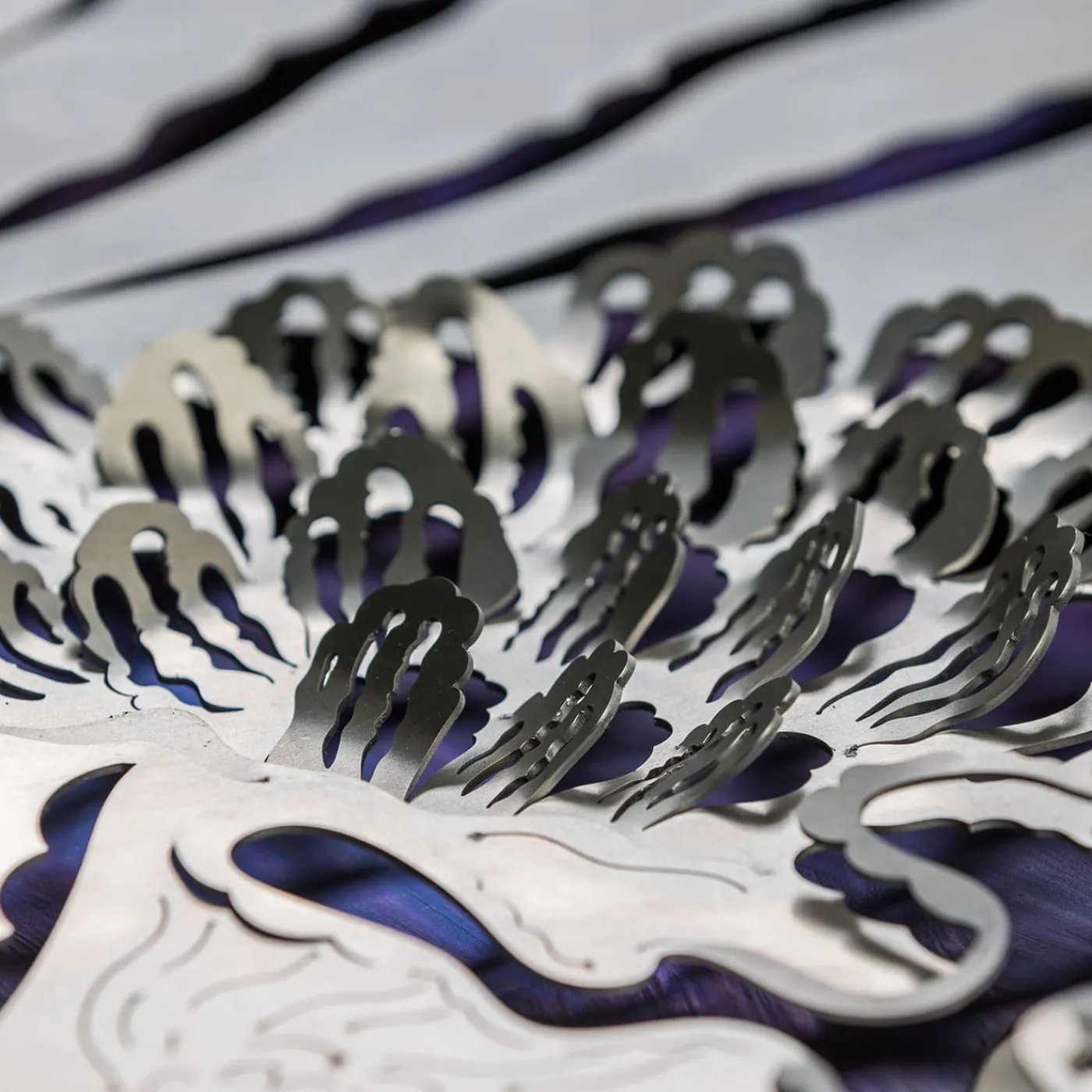 Ispirato alla poesia “L’onda” di Gabriele D’Annunzio, Caelum Contingo è un omaggio alle onde accarezzate dalla brezza, che frammenta e disperde acqua e spuma: “Il vento rinforza, altra onda nasce, si perde […] un fiocco di spuma che salta!”. Quest’opera fa parte di una collezione limitata di soli 10 pezzi. Edizione limitata.