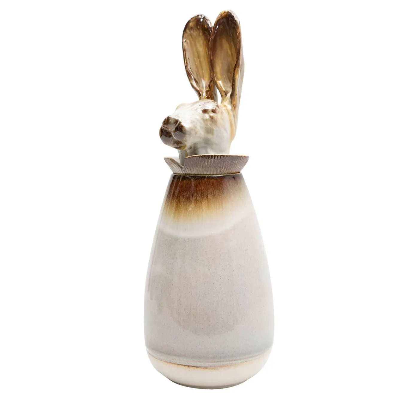 Questo vaso si ispira direttamente ai vasi canopi egizi; è una reinterpretazione ironica e contemporanea di un oggetto ancestrale, nume tutelare della quiete domestica. Il coniglio è infatti un simbolo di abbondanza, prosperità e longevità e più semplicemente un bellissimo animale. Realizzata a mano e smaltata con ossidi e cristalli, l’opera diventa un oggetto prezioso e scultoreo.