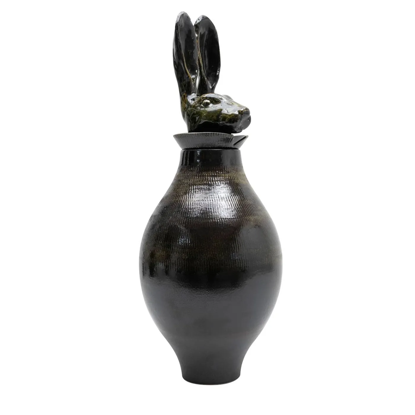 Questo vaso si ispira direttamente ai vasi canopi egizi; è una reinterpretazione ironica e contemporanea di un oggetto ancestrale, nume tutelare della quiete domestica. Il coniglio è infatti un simbolo di abbondanza, prosperità e longevità e più semplicemente un bellissimo animale. Realizzata a mano e smaltata con ossidi e cristalli, l’opera diventa un oggetto prezioso e scultoreo.