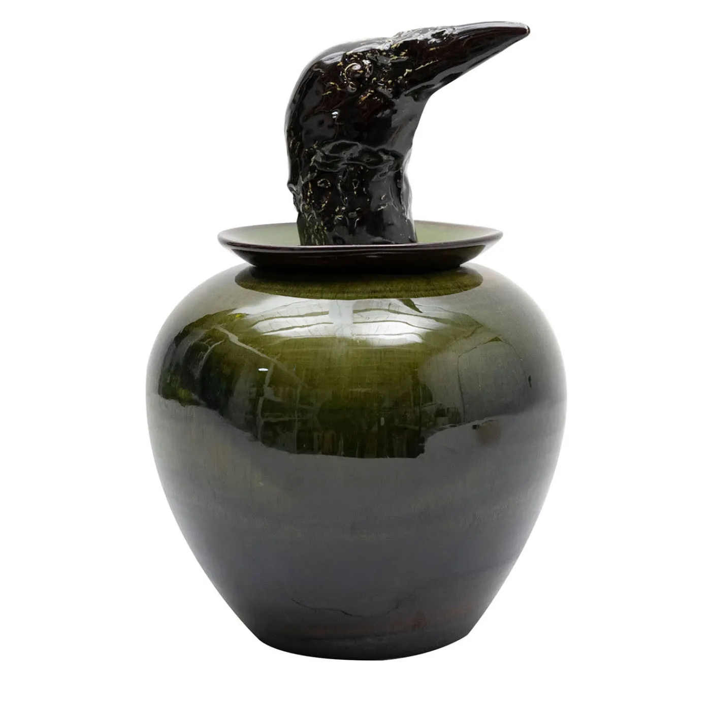 Questo vaso si ispira direttamente ai vasi canopi egizi; è una reinterpretazione ironica e contemporanea di un oggetto ancestrale, nume tutelare della quiete domestica. Secondo la mitologia di alcune stirpi indiane, fu il corvo a creare la terra: l’uccello avrebbe portato nel becco i ciottoli che lasciò cadere in mare per formare le prime isole. Realizzata a mano e smaltata con ossidi e cristalli, l’opera diventa un oggetto prezioso e scultoreo.