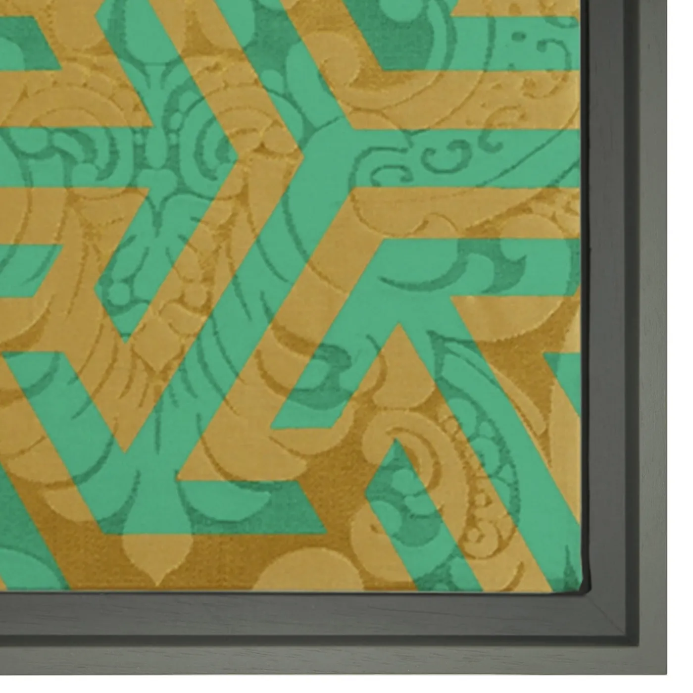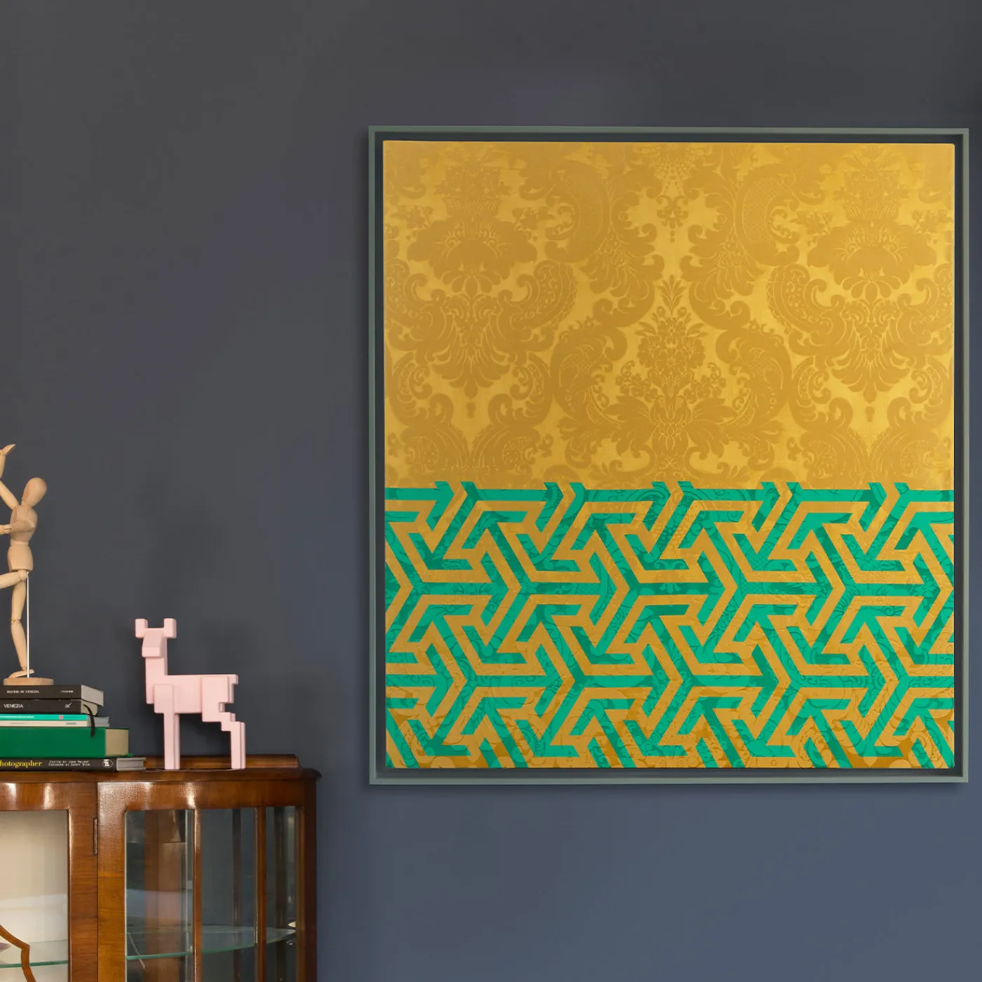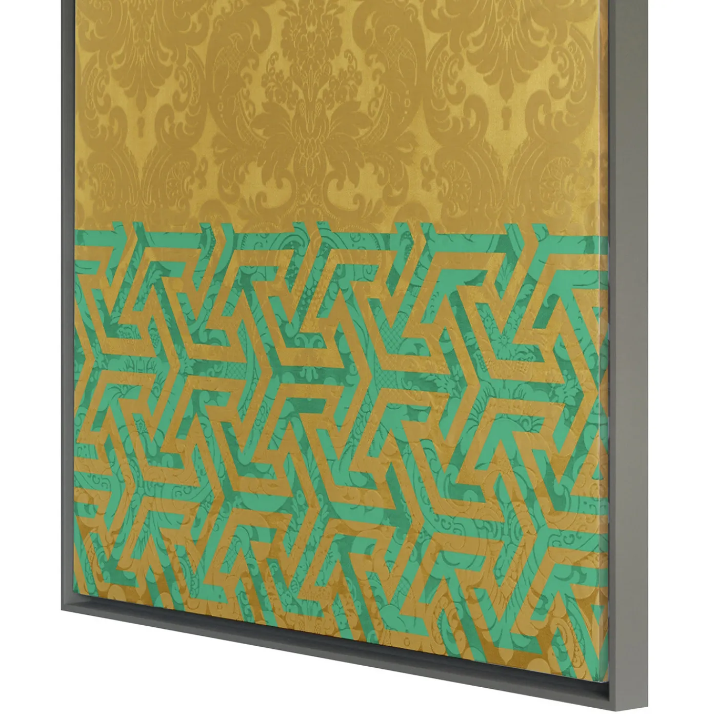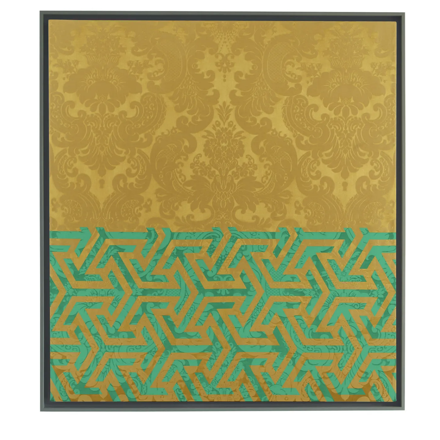 Un’armoniosa interazione tra arte e artigianato contraddistingue questo splendido pannello decorativo di Amelia Corvino. Realizzato nelle più prestigiose botteghe di tessitura veneziane, è realizzato in damasco dorato e imbottito internamente con cotone pregiato. Proprio come un contrappunto musicale, il pezzo vanta un motivo unico che combina il tipico motivo damascato occidentale con un motivo geometrico orientale appartenente all’arte islamica. La cornice in legno è disponibile su richiesta.