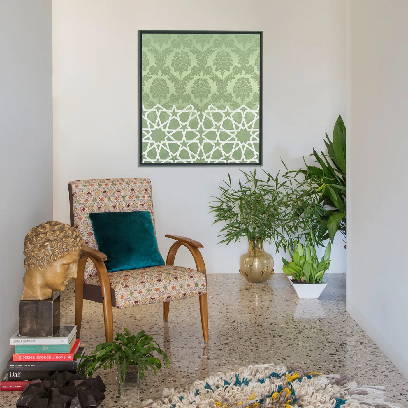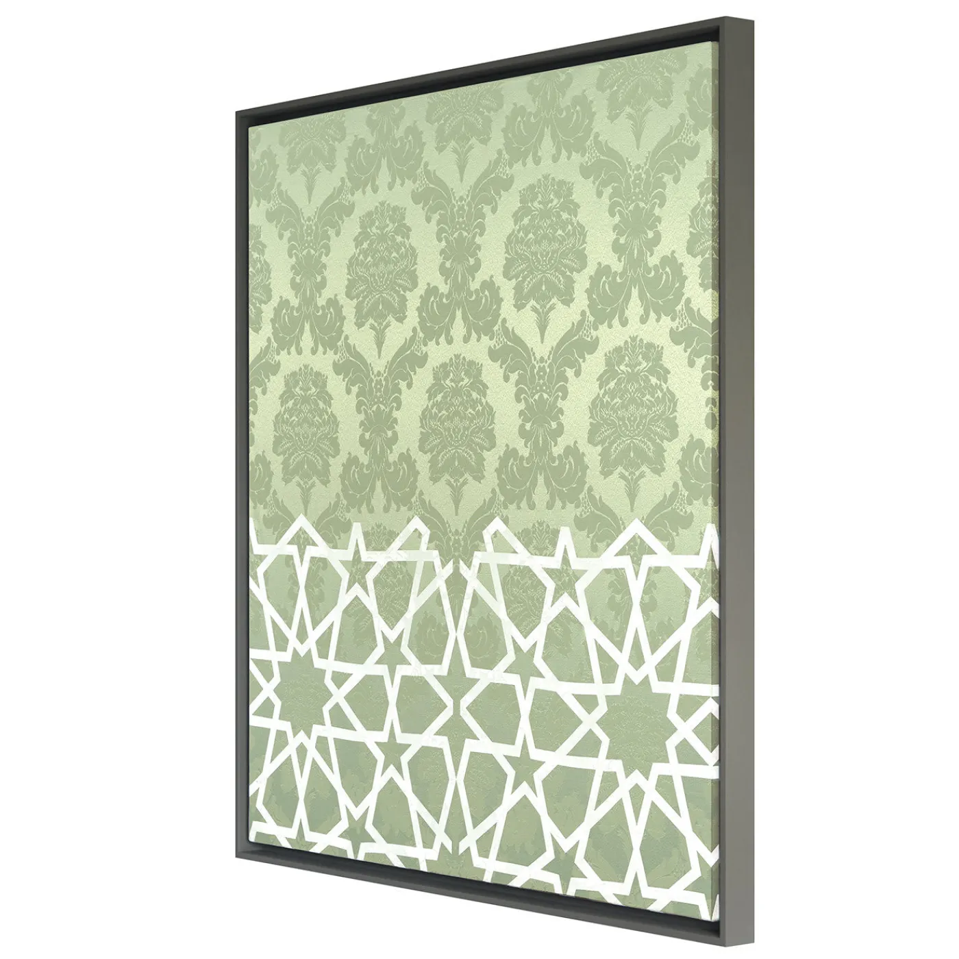 Impeccabile pezzo d’arredamento di Amelia Corvino, questo pannello è realizzato in un raffinato damasco verde menta proveniente dalle più prestigiose tessiture veneziane. Riempito internamente con un pregiato tessuto di cotone, su richiesta è disponibile una cornice in legno. Ricordando la superba combinazione melodica nota in musica come contrappunto, questo pezzo funge da ponte artistico tra Oriente e Occidente, combinando il tipico motivo damascato nella parte superiore con un motivo geometrico islamico nella parte inferiore.