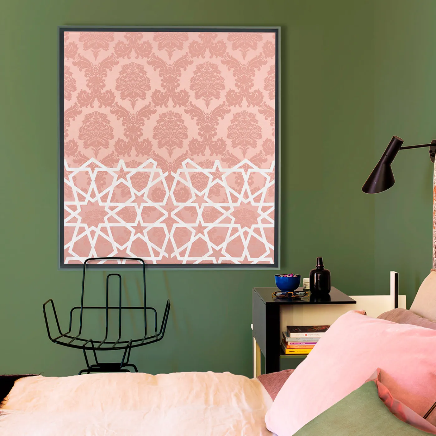 Un’armoniosa interazione tra arte e artigianato contraddistingue questo splendido pannello decorativo di Amelia Corvino. Realizzato nelle più prestigiose botteghe di tessitura veneziane, è realizzato in damasco rosa e imbottito internamente con cotone pregiato. Proprio come un contrappunto musicale, il pezzo vanta un motivo unico che combina il tipico motivo damascato occidentale con un motivo geometrico orientale appartenente all’arte islamica. La cornice in legno è disponibile su richiesta.