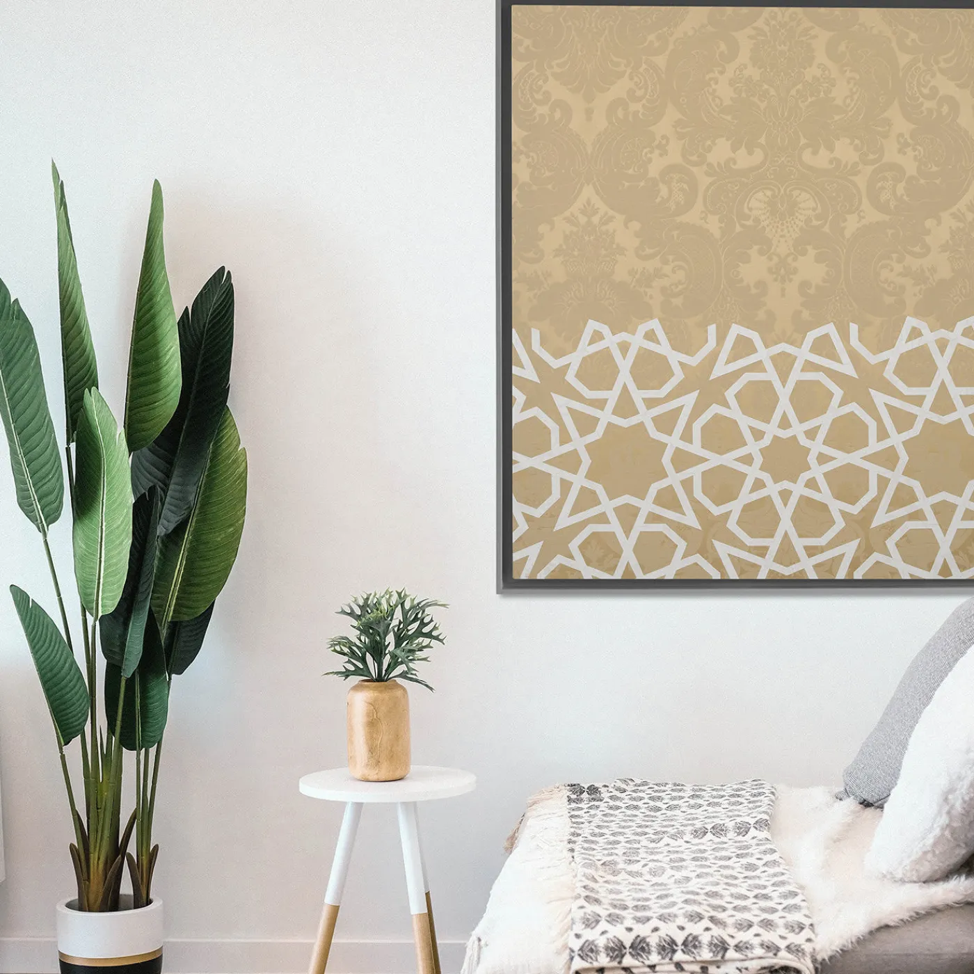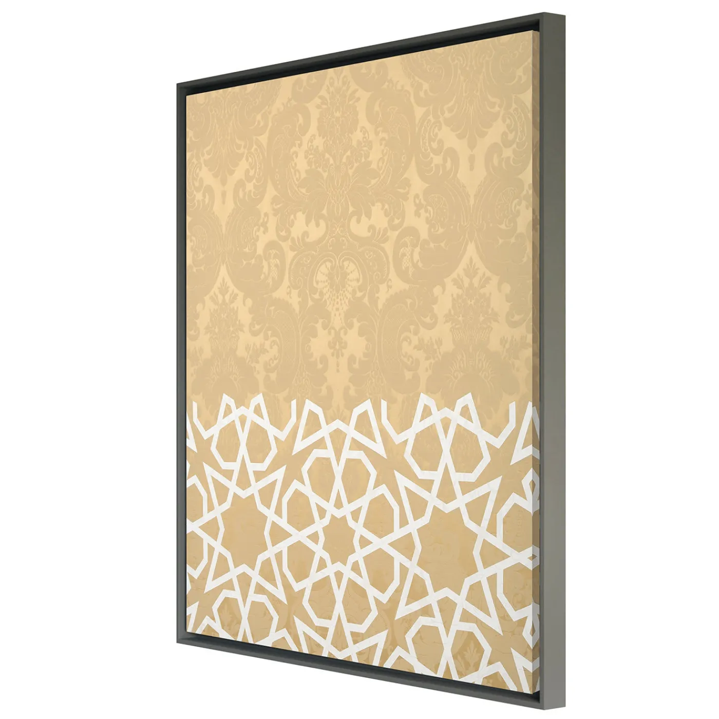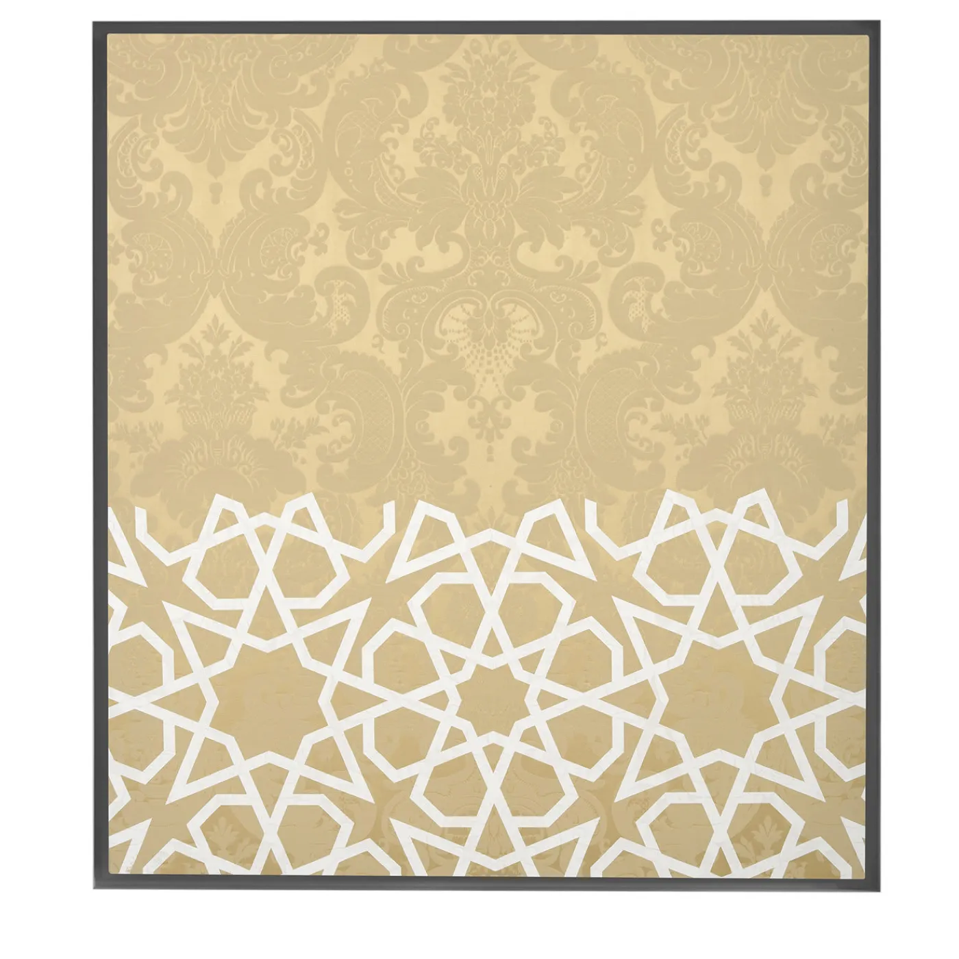 Un’armoniosa interazione tra arte e artigianato contraddistingue questo splendido pannello decorativo di Amelia Corvino. Realizzato nelle più prestigiose botteghe di tessitura veneziane, è realizzato in damasco beige e imbottito internamente con cotone pregiato. Proprio come un contrappunto musicale, il pezzo vanta un motivo unico che combina il tipico motivo damascato occidentale con un motivo geometrico orientale appartenente all’arte islamica. La cornice in legno è disponibile su richiesta.