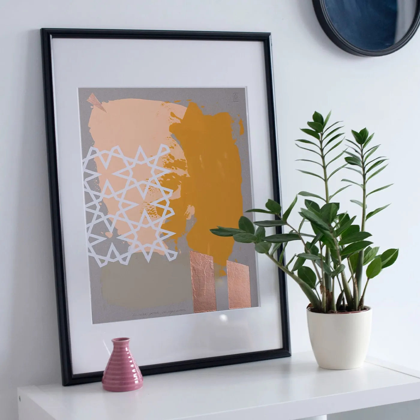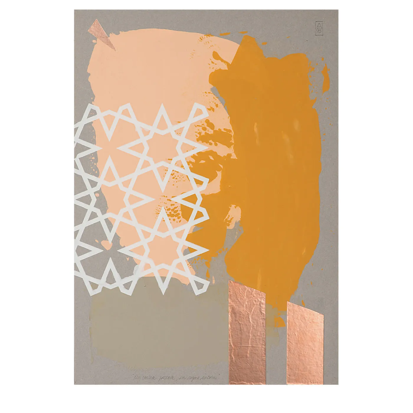 Con forme primitive dai toni tenui ma distintivi che fluttuano nello spazio, arricchite da un motivo di contrappunto e da brillanti inserti in rame, quest’opera d’arte si chiama “sogni e ombre” ed è ispirata alle poesie di Pedro Salinas. L’opera è stata realizzata a mano con la tecnica della tecnica mista su cartone utilizzando colori acrilici, serigrafia e metodi di collage e infine stampata su carta 100% cotone. Si prega di contattare il Concierge per includere una cornice o per ottenere la versione originale in cartone dipinto.
