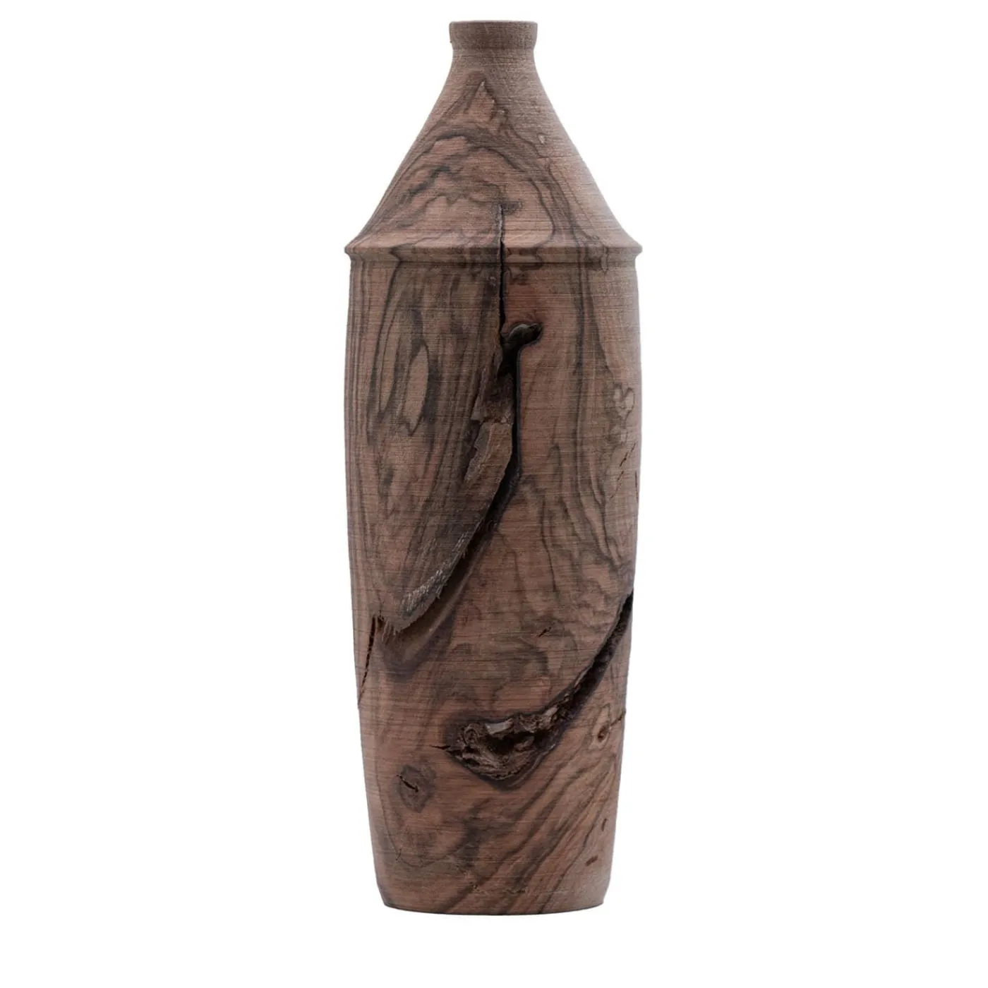 Meticolosamente lavorato e intagliato a mano, questo splendido vaso decorativo stupisce per le eccezionali venature del legno, accentuate dalla silhouette alta e slanciata e dalle linee aggraziate. Realizzato in legno di noce, è trattato con olio d’oliva per sigillare le sue proprietà naturali e prevenire il deterioramento. Non riempire o immergere in acqua, pulire solo con un panno umido.