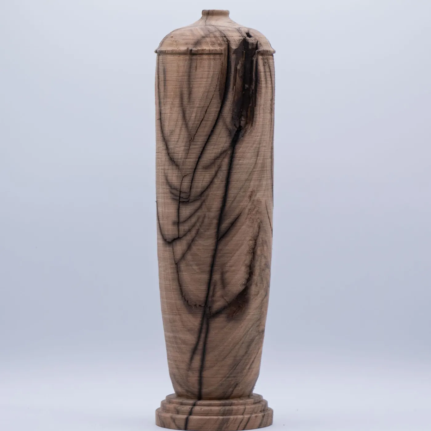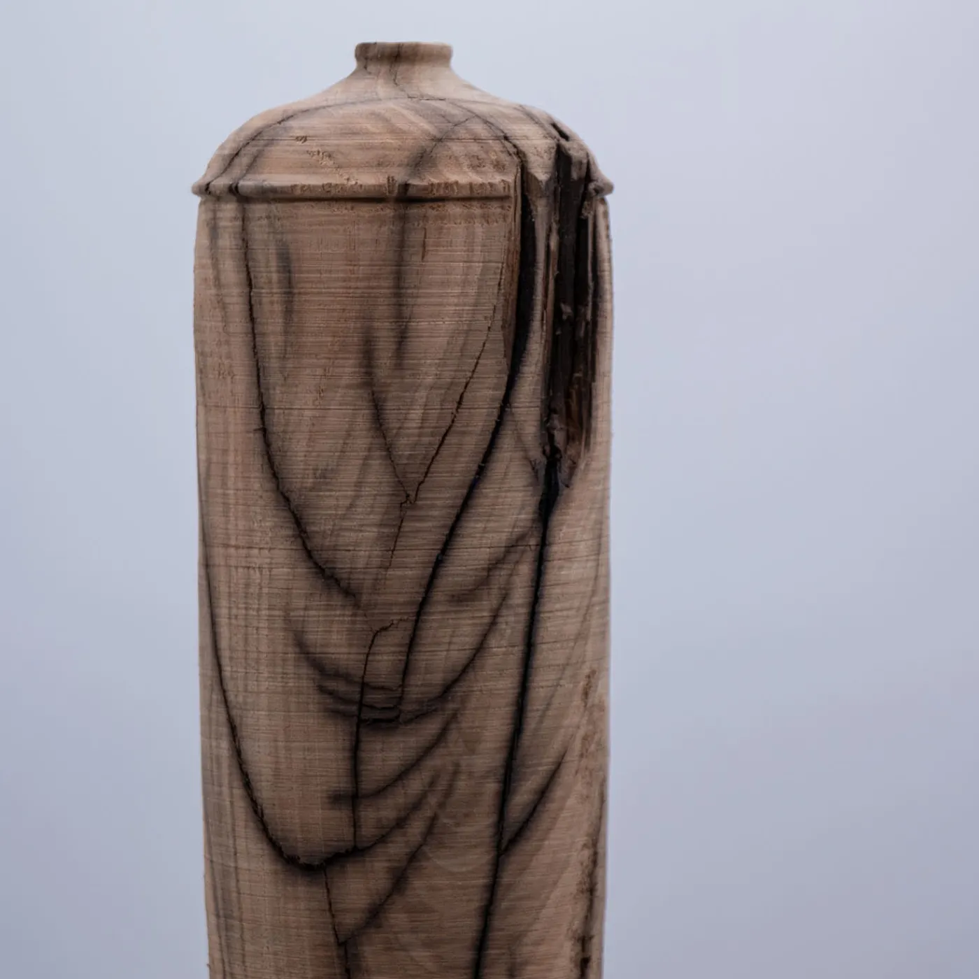 Interamente realizzato a mano dal maestro falegname Andrea Celestino, questo splendido vaso decorativo stupisce per l’eccezionale venatura del legno e la silhouette aggraziata, montata su una base a gradini. Realizzato in legno di noce, il legno è trattato con olio d’oliva per sigillare le sue proprietà naturali e prevenire il decadimento. Non riempire o immergere in acqua, pulire solo con un panno umido.