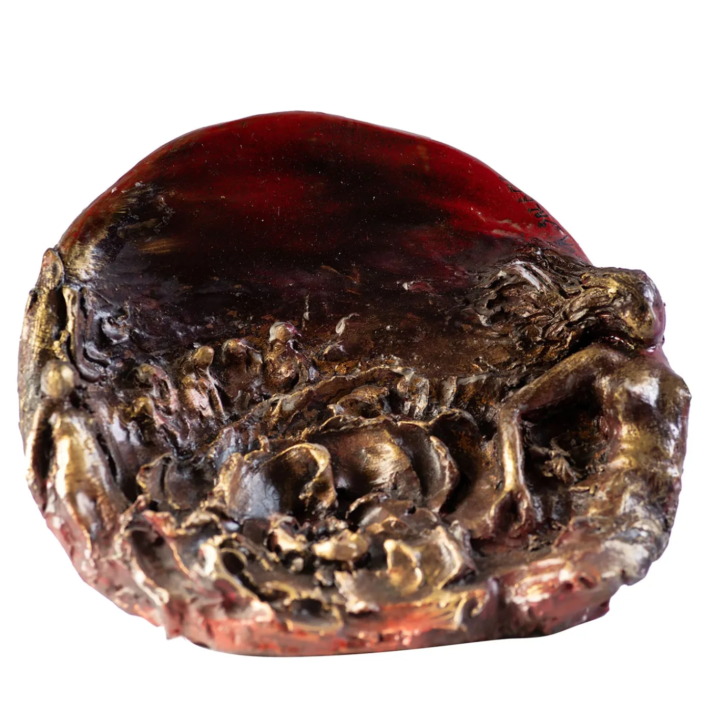 La silhouette di una donna che emerge e si fonde con un campo fiorito contraddistingue questa scultura in ceramica unica dell’artista Angelo Salemi. Smaltata in rosso con un affascinante effetto sfumato verso l’oro anticato, attualizza la concezione poetica dell’artista della donna come figura celestiale, la cui perfezione può essere associata a quella della natura.