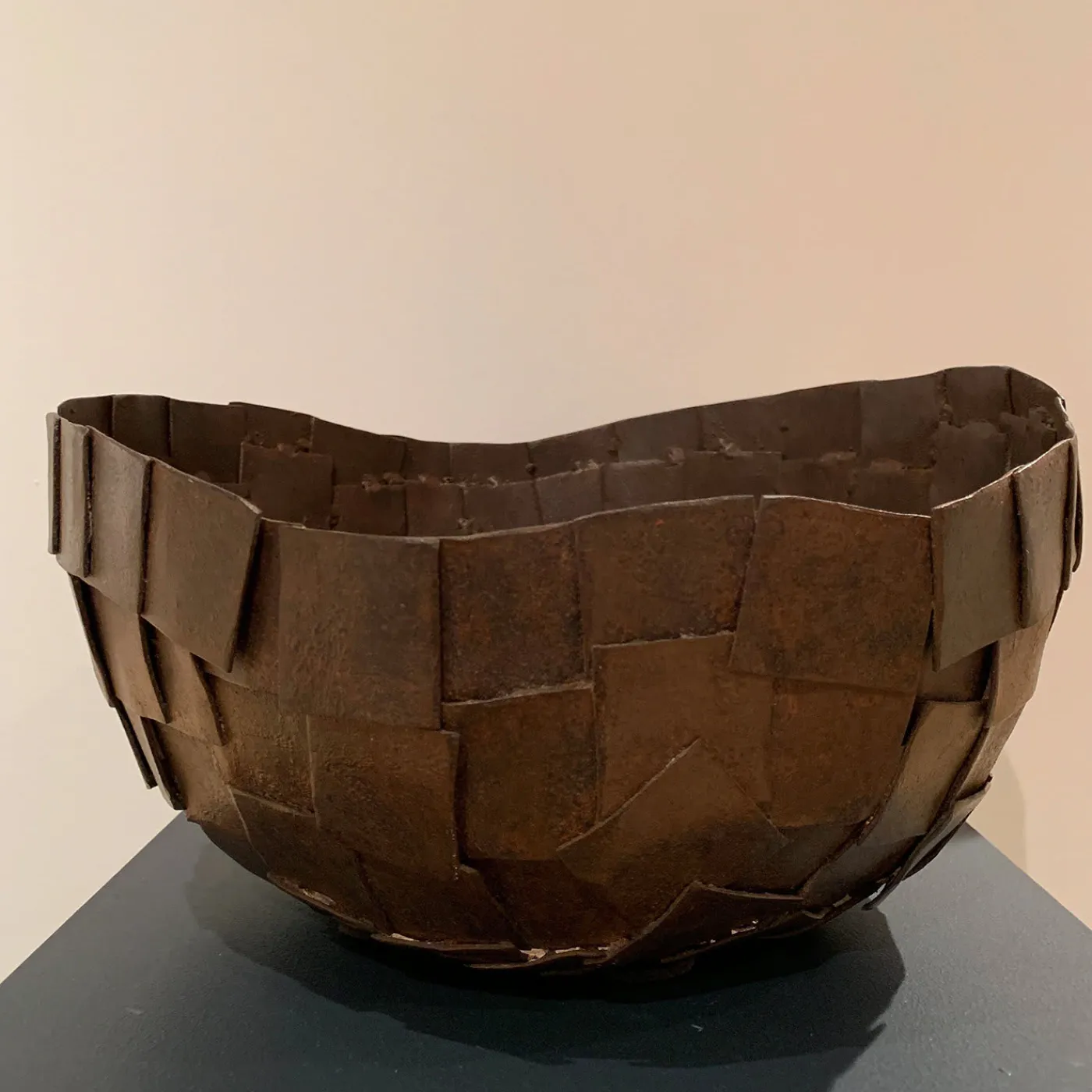 Questo suggestivo vaso è realizzato con piccole lastre di metallo curvato e assemblato con una fitta trama; la finitura è ottenuta con ruggine e vari passaggi di cera, che danno vita a una patina che ricorda il cuoio, da cui il nome.