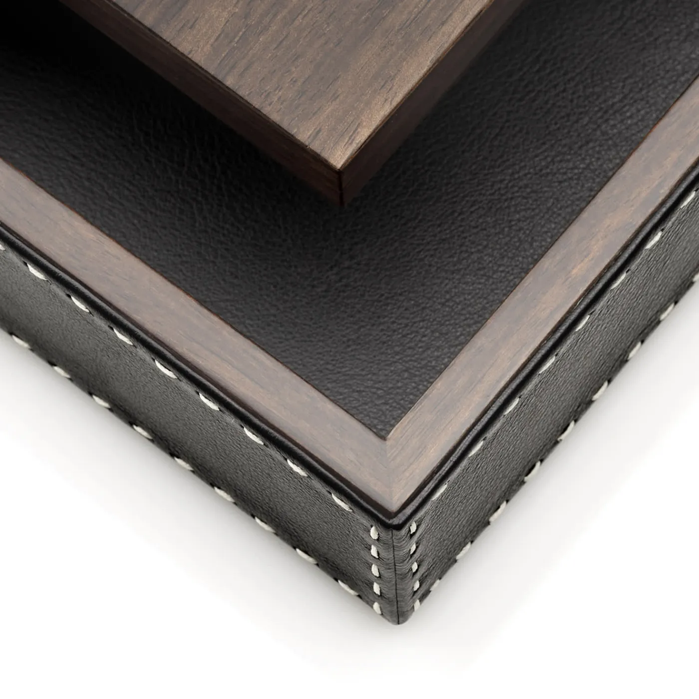 Scatola rettangolare in pelle Aida con lavorazione a ciottoli, colore Onyx e cuciture avorio fatte a mano. Coperchio in impiallacciatura di ebano Amara opaco con maniglia scultorea in corno. Per ulteriori informazioni, contattare il Concierge.