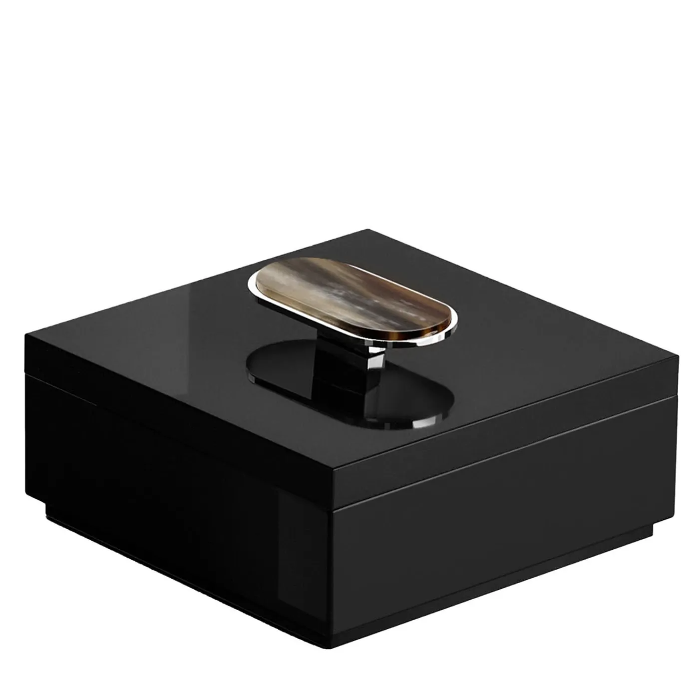 Sofisticato complemento di un comò o di una vanità, questo cofanetto è un’ottima soluzione per riporre i gioielli preferiti. L’intera struttura in legno e il coperchio coordinato sono caratterizzati da una finitura nera lucida di grande eleganza, interrotta solo dalla maniglia in ottone cromato e dal pregiato inserto in corno. Una luminosa versione avorio è disponibile nel catalogo Artemest.