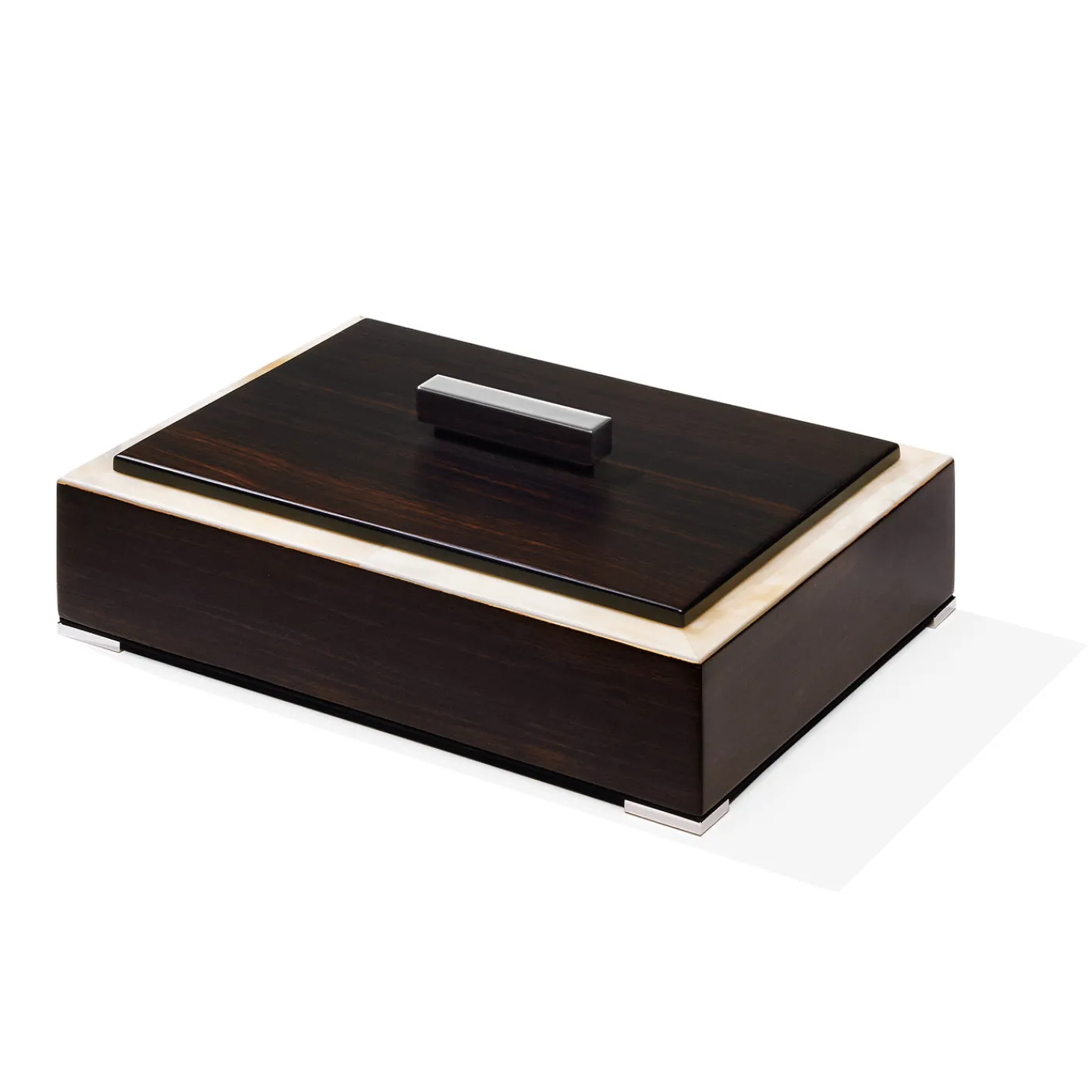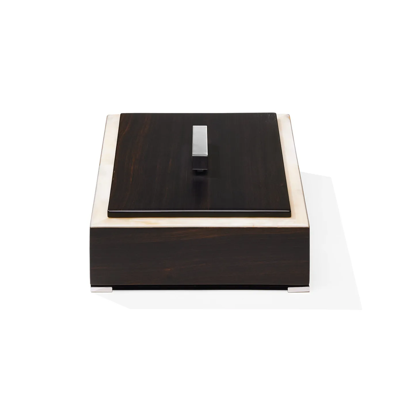 Scatola rettangolare caratterizzata da un telaio in corno opaco, impreziosito da un coperchio in ebano Amara. Il coperchio è completato da una maniglia in ottone cromato, in armonia con i piedini nello stesso materiale. L’interno, foderato in pelle Tosca nera, esprime cura e raffinatezza nei dettagli. Ideale per custodire e organizzare piccoli oggetti con stile ed eleganza.