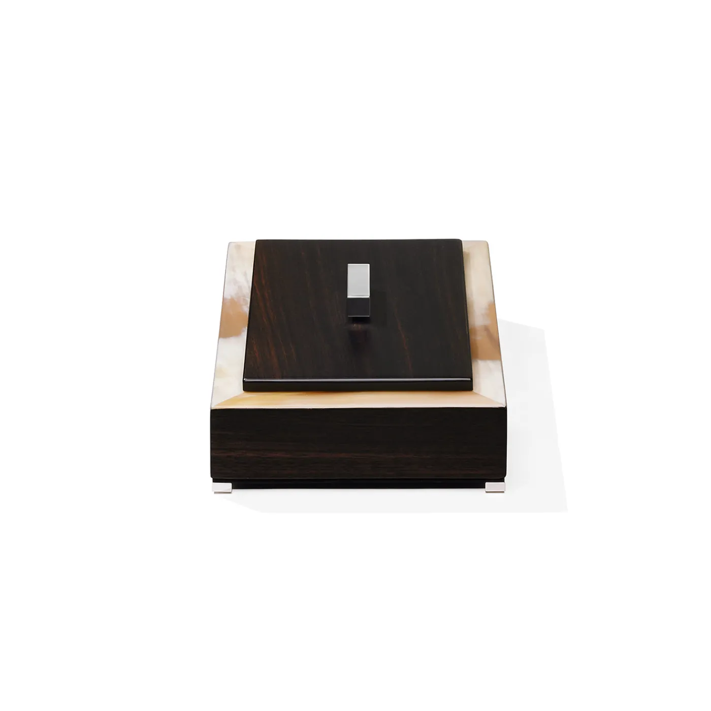 Scatola rettangolare caratterizzata da un telaio in corno opaco, impreziosito da un coperchio in ebano Amara. Il coperchio è completato da una maniglia in ottone cromato, in armonia con i piedini nello stesso materiale. L’interno, foderato in pelle Tosca nera, esprime cura e raffinatezza nei dettagli. Grazie alle sue dimensioni compatte, è ideale per custodire e organizzare piccoli oggetti con stile ed eleganza.