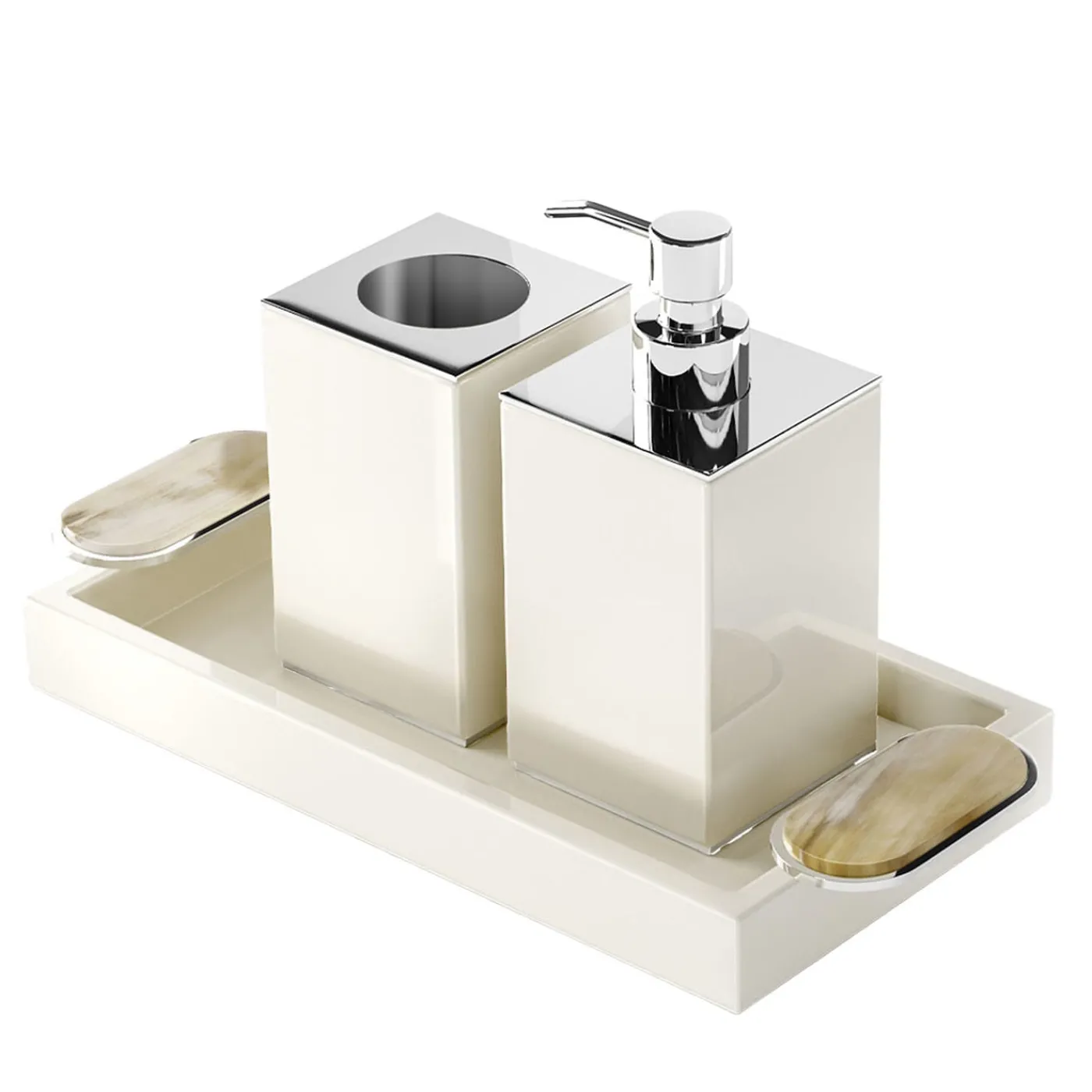 Caratterizzato dalla presenza di lussuosi inserti di corno pregiato lungo le maniglie, un vassoio compatto funge da elegante punto di appoggio per il dispenser di sapone e il portaspazzolino di cui si compone il set. Una sublime combinazione di finitura laccata avorio lucida e ottone cromato conferisce una luminosità sorprendente, affermando il suo fascino moderno. Contattare il Concierge per le opzioni di personalizzazione.
