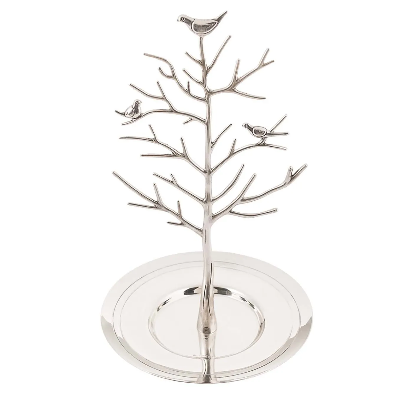 Realizzato in lega argentata con il metodo della fusione a cera persa, questo albero portagioie fa una bella figura grazie alla sua lucentezza unica e alla sua silhouette delicata, completa di tre affascinanti uccelli appollaiati. Perfetto su una cassettiera o un vanity con collane e bracciali che adornano i rami, mentre il piatto forgiato a mano è perfetto per contenere anelli, orecchini e qualsiasi altro accessorio sciolto.