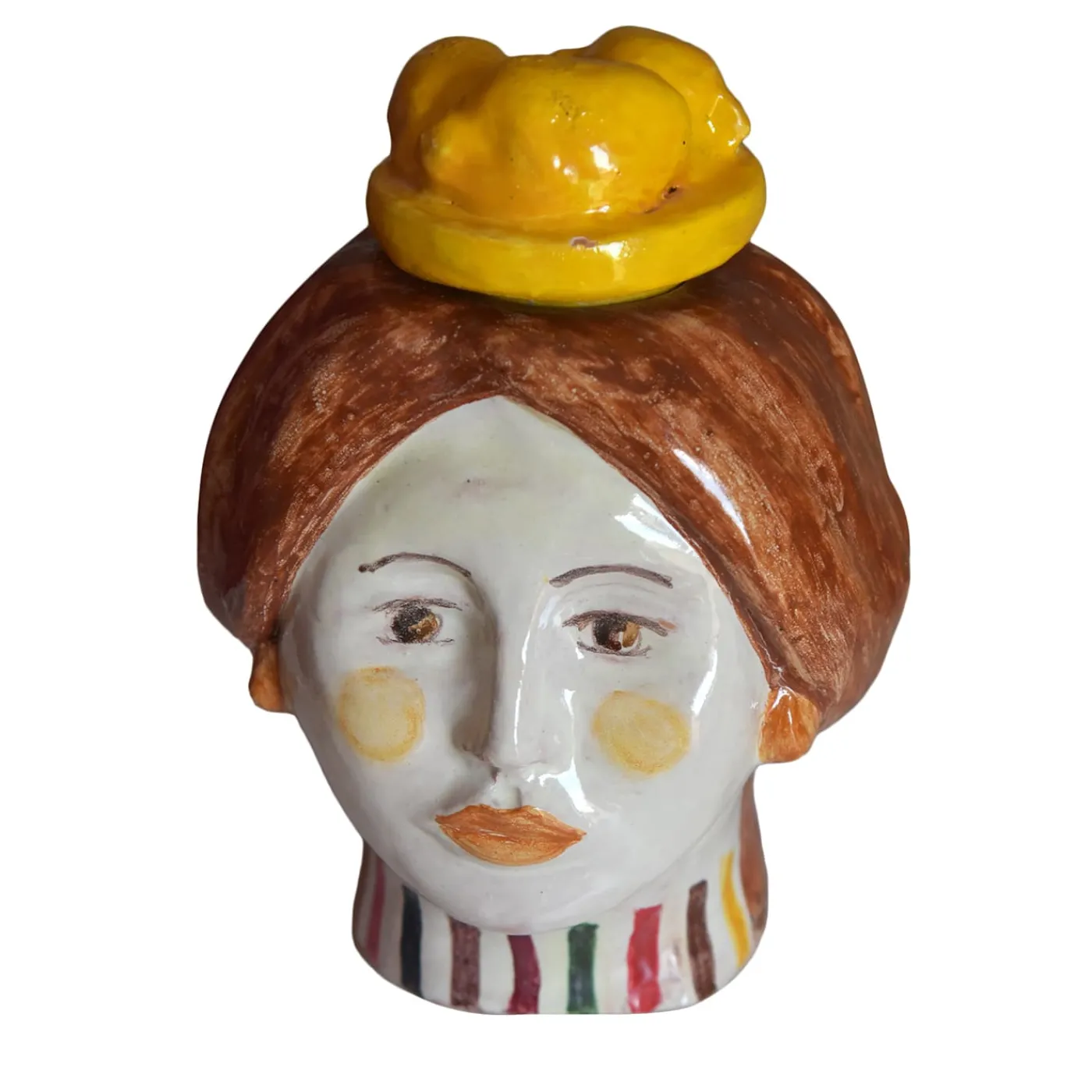 Moderna interpretazione della tradizionale testa di moro siciliana, questo moderno pezzo in ceramica vanta la preziosità di un’opera d’arte singolare abilmente realizzata e decorata a mano. Originariamente realizzata in argilla rossa, la maiolica lucida è il risultato di due cotture a 980° che sigillano anche i dettagli irripetibili dei suoi tratti femminili. Vivace complemento d’arredo per un terrazzo o una consolle, è corredato da un cestino a forma di limone estraibile dalla parte superiore.