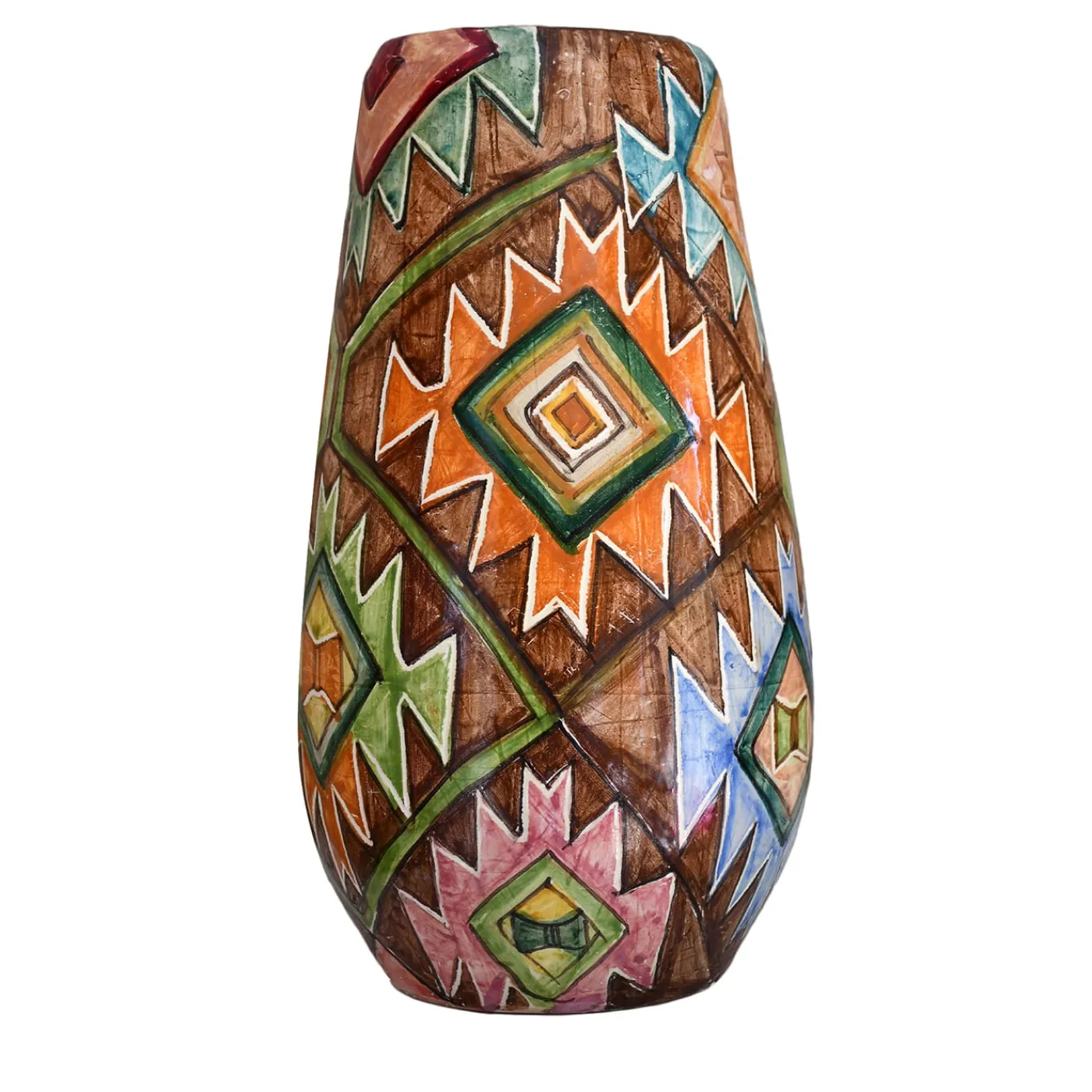 Vibrante nelle tonalità come nel motivo, questo singolare vaso artigianale è il risultato di un minuzioso processo di decorazione manuale che ricrea i motivi tipici dei tappeti Kilim dell’Anatolia. Pennellate sicure e minute contraddistinguono l’ipnotizzante disegno, che sfoggia dettagli e sfumature irripetibili, a testimonianza dell’esclusiva qualità artigianale del vaso.