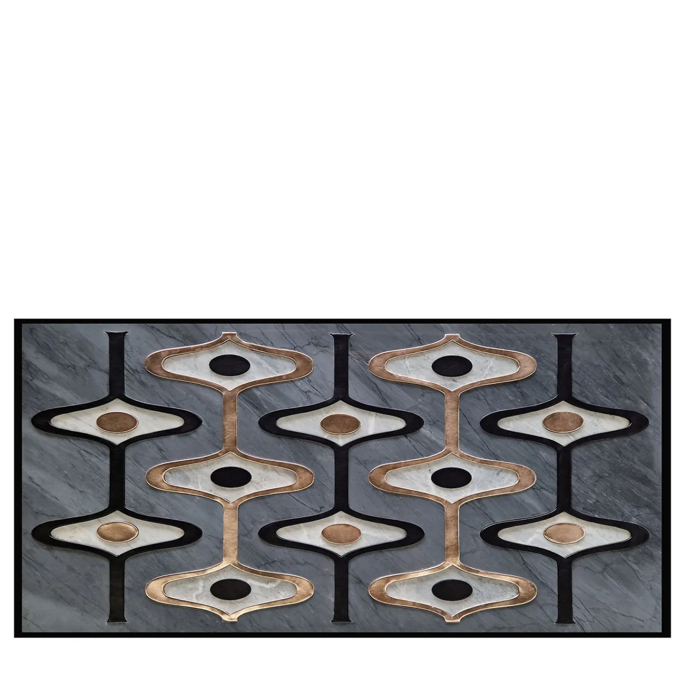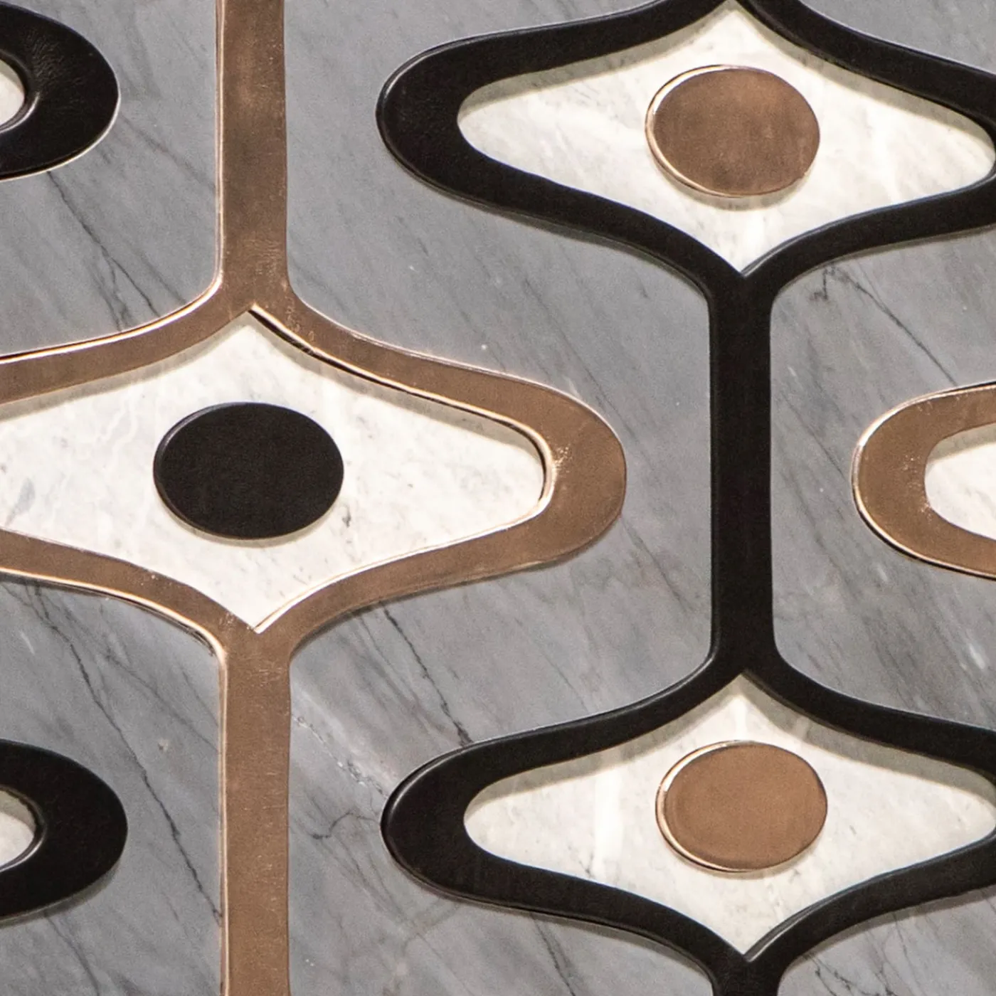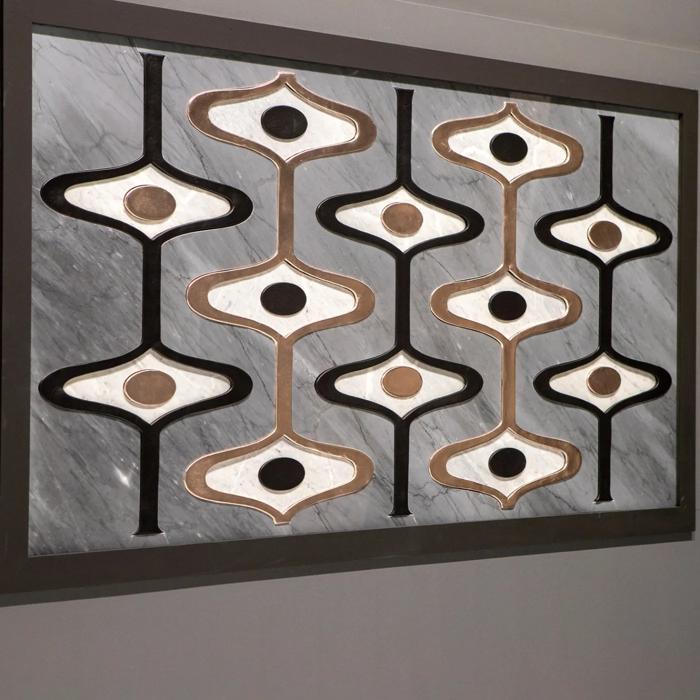 Questo pannello decorativo combina il marmo Imperial Bardiglio con accenti in pelle laminata nelle finiture oro rosa e nero opaco, creando contrasti sorprendenti tra luce, ombra e venature naturali. Caratterizzato da un’assemblaggio millimetrico preciso su un supporto in alluminio a nido d’ape, offre sia integrità strutturale che estetica raffinata. Il risultato è una sofisticata reinterpretazione contemporanea di materiali tradizionali, adattabile a una vasta gamma di contesti architettonici.