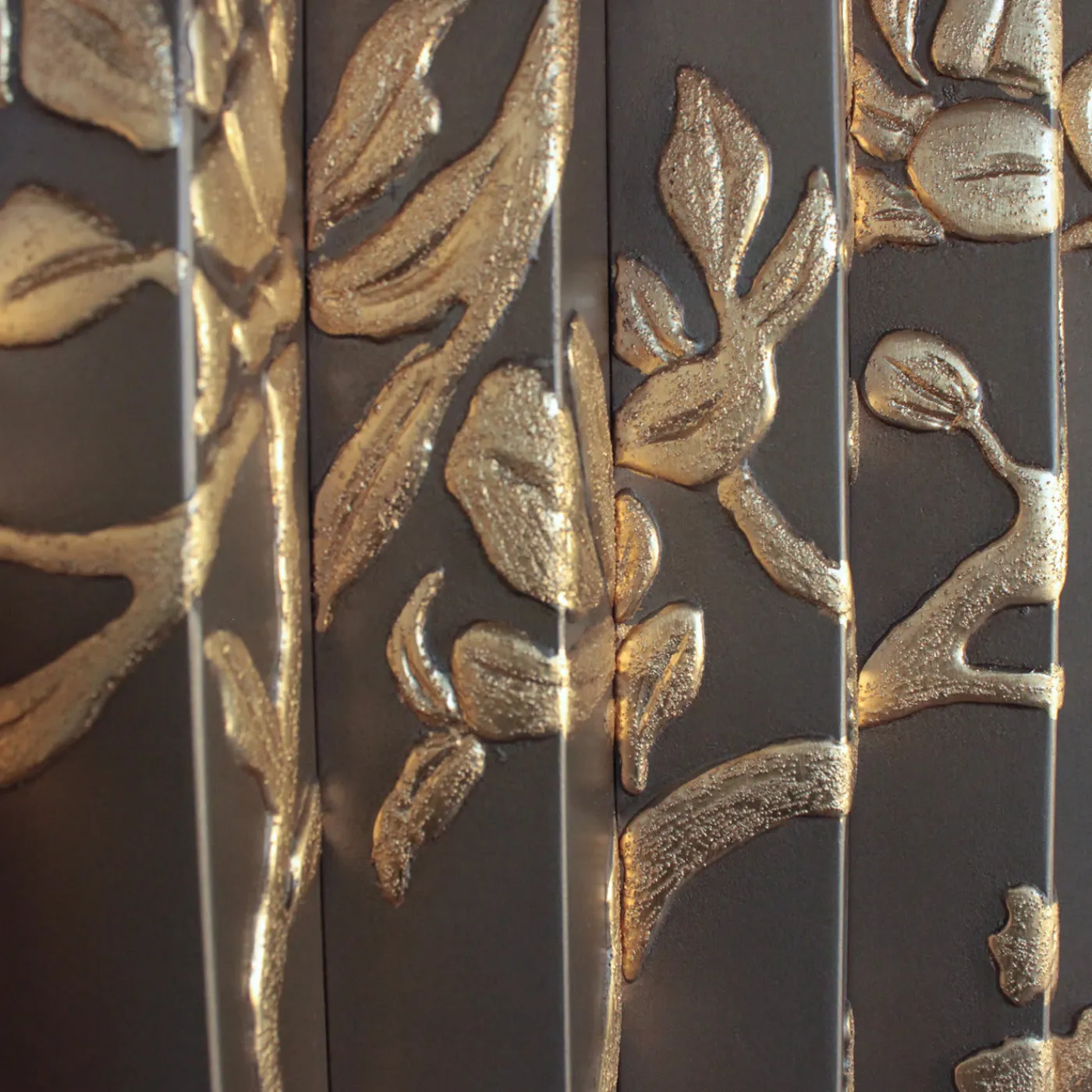 Un design sofisticato è l’elemento caratterizzante di questo splendido pannello decorativo a boiserie. Il decoro floreale è applicato a mano sul rivestimento in gesso e poi trattato con foglia d’oro. La base del legno è laccata in grigio semilucido e l’effetto finale ricorda il plissè di un tessuto piegato. Il disegno e i colori sono personalizzabili.