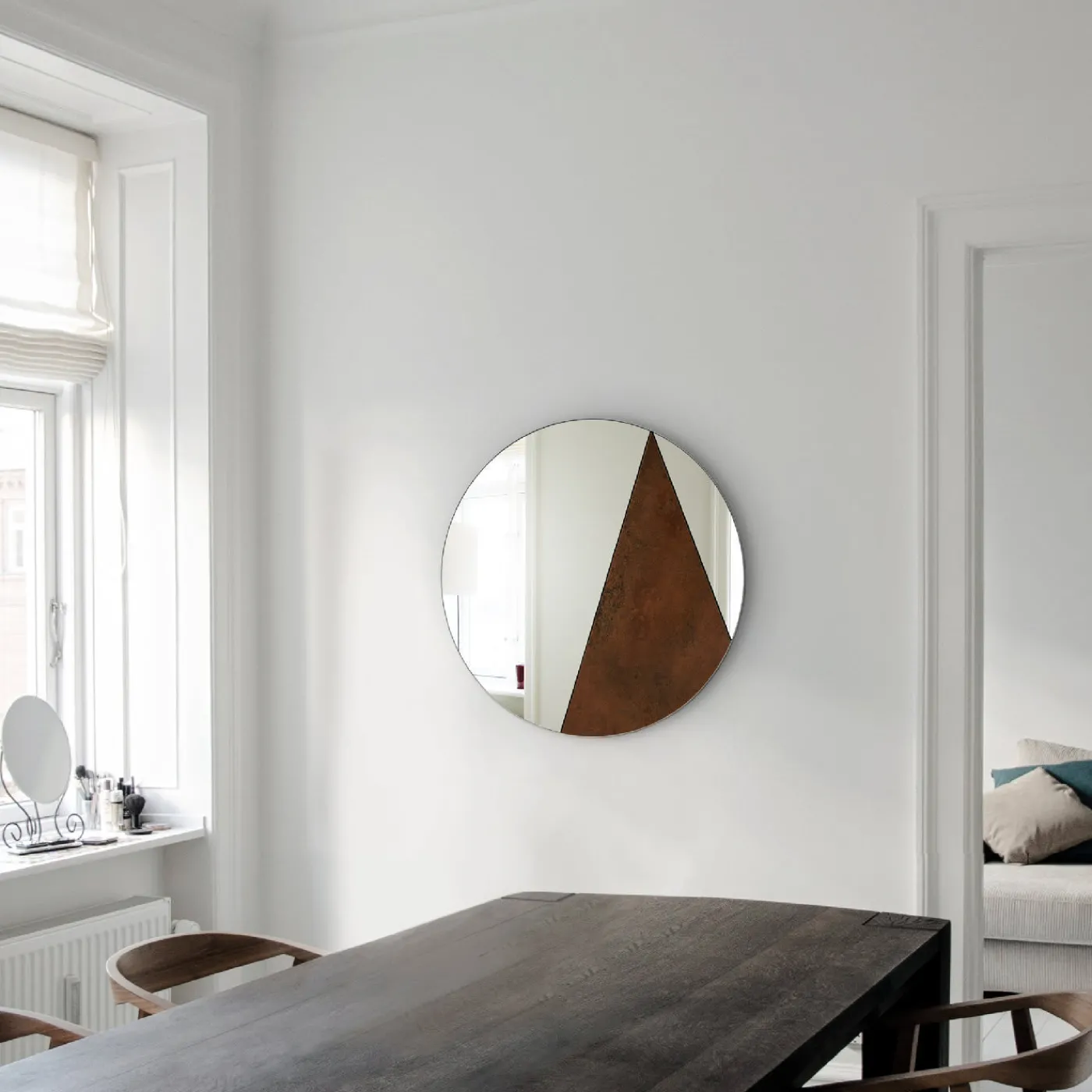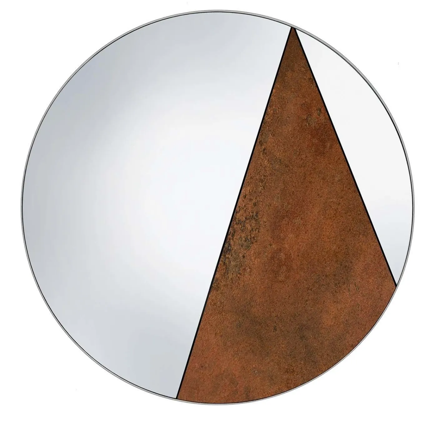 Questo squisito specchio è prodotto a mano e si farà notare in un ambiente minimalista, aggiungendo una superficie riflettente funzionale e uno splendido accento decorativo a un ingresso contemporaneo o a un salotto industriale. La silhouette rotonda presenta una base in legno con tre elementi, due in vetro specchiato e uno in acciaio corten, uniti da una cornice in acciaio. L’effetto è audace e dinamico e può essere abbinato ad altri pezzi di Atlas per un effetto coesivo.