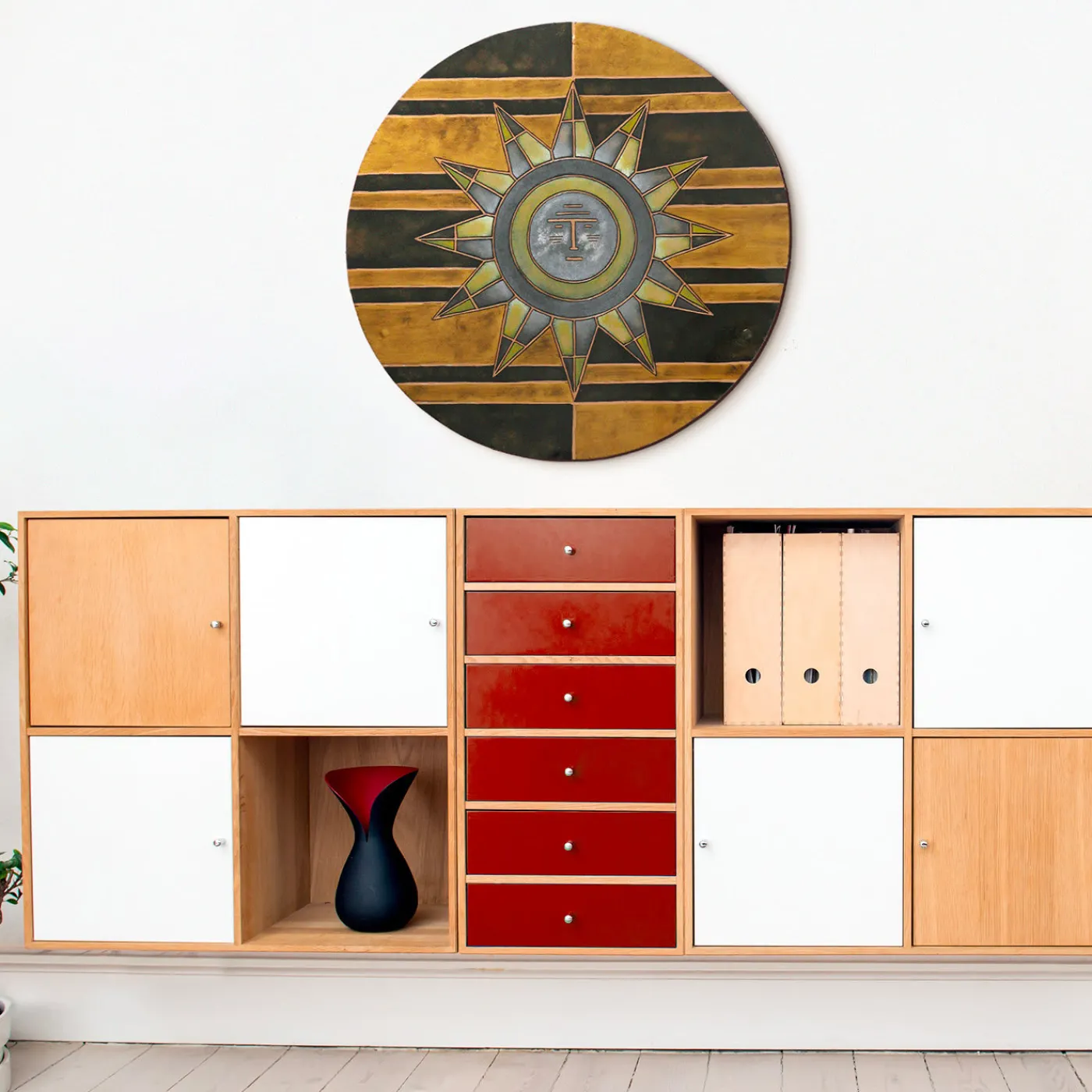 Questo piatto artistico, unico e originale, sarà una decorazione da parete di grande effetto per un ingresso o un soggiorno moderno e di ispirazione industriale. Forgiato, inciso e brunito interamente a mano, questo piatto in acciaio riproduce il motivo tessile del Sole elaborato negli anni Cinquanta dal designer Eugenio Tavolara per i tessitori sardi di Sarule. Il centro della forma rotonda ospita il sole nella sua gloria, appoggiato su uno sfondo spezzato a strisce marroni e beige, circondato da dodici raggi in argento e giallo alternati. Questo pezzo è disponibile anche in 50 e 33 cm, o in misure personalizzate da quotare su richiesta.