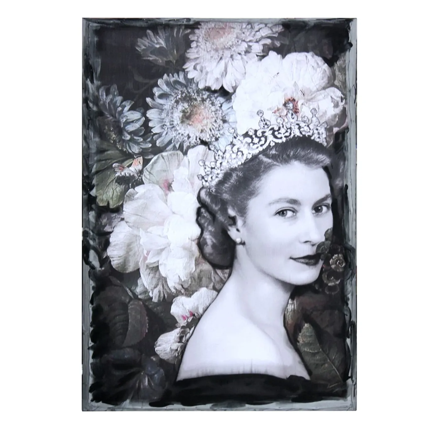 Splendida opera d’arte artigianale di Barbara Petecca, questo arazzo aggiungerĂ un carattere distintamente anticonvenzionale a un interno eclettico. Fissato su una tela di legno grezzo, il tessuto stampato presenta un ritratto in bianco e nero della giovane Regina Elisabetta II. Rifinito con dettagli dipinti a mano con colori acrilici, qualsiasi variazione rispetto all’articolo illustrato fa parte della sua natura artigianale.