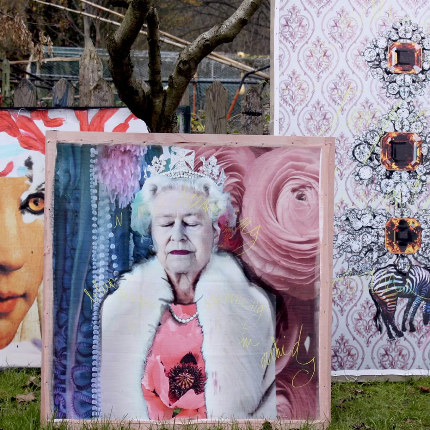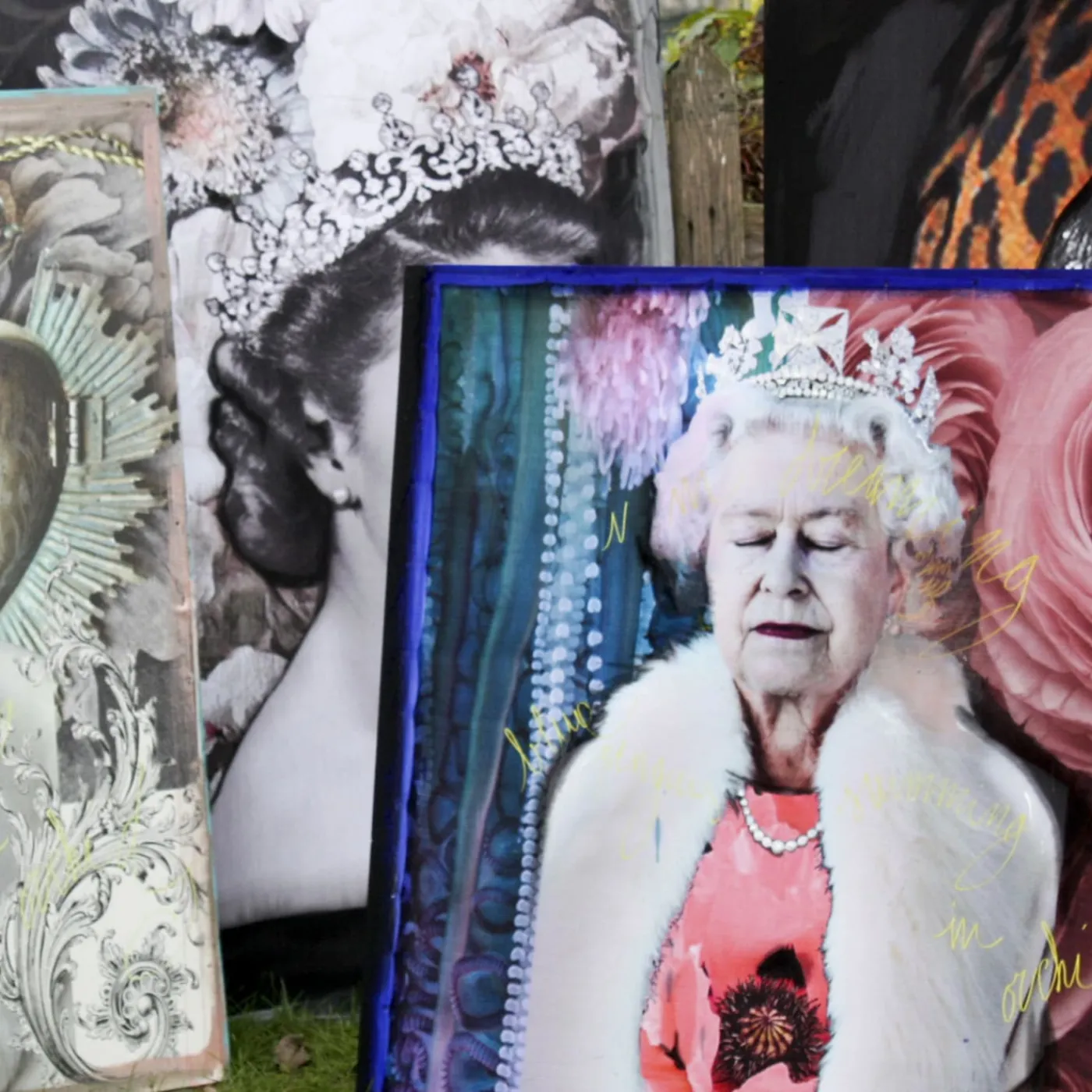 Unico e glamour, questo magnifico arazzo diventerà un affascinante punto focale in qualsiasi interno. Un ritratto eclettico e vintage della Regina Elisabetta II contraddistingue la sua superficie in tessuto stampato, ornata da dettagli dipinti a mano con colori acrilici. Opera d’arte sublime in edizione limitata, è incorniciata su una tela di legno grezza e può presentare leggere variazioni dovute alla sua natura artigianale.