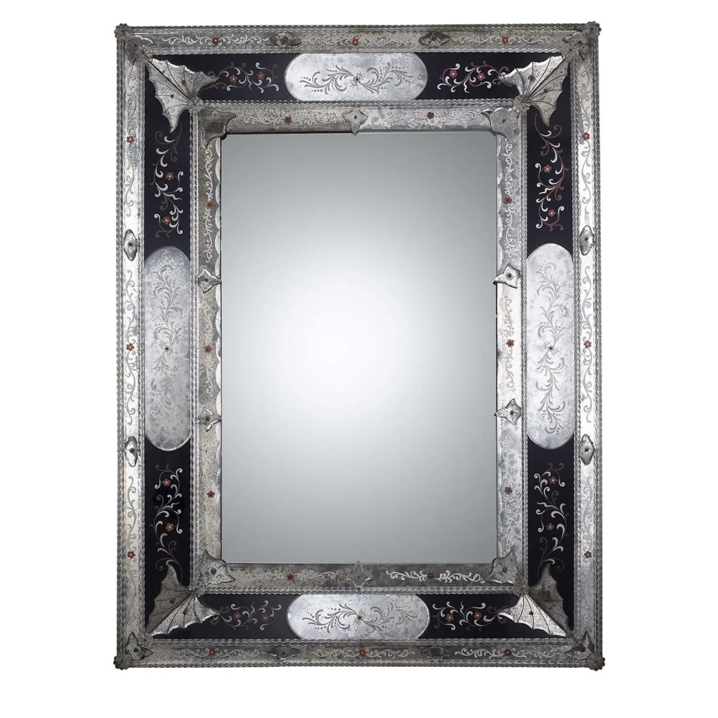 Questo specchio rettangolare di grande effetto è un’esibizione di luce e stile. Il pezzo presenta una cornice esterna in argento e un’ulteriore cornice interna in argento, con una sezione nera a contrasto al centro, ornata da volute di colore, foglie d’argento agli angoli e decorazioni d’argento ai lati. Questo specchio veneziano è decorato con aste di torchon e rosette di cristallo, insieme a elementi di vetro sagomato e molato. Le decorazioni floreali sono incise a mano con una mola di arenaria e diamante e smaltate su vetro dipinto di blu, specchiato con uno speciale processo di anticatura.
