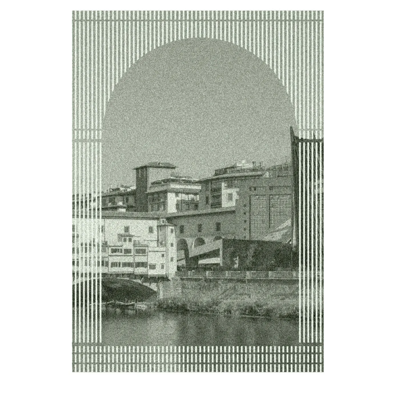 Parte di un trittico tessile dalla duplice funzione di coperta e arazzo, con ogni città visualizzata come un paesaggio visto da trifore appartenenti a diversi stili architettonici. Tessuto jacquard con tecnica piquè. 100% lana merino extra fine. 19,5 Micron.