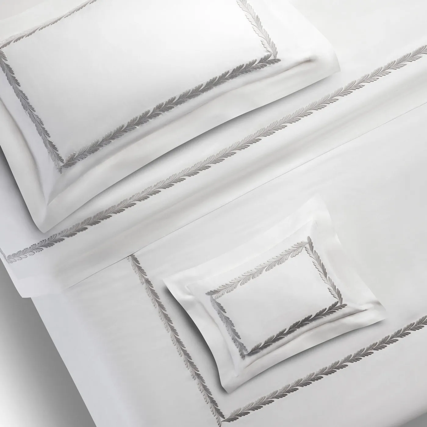 Il set king size Botero presenta un raffinato bordo ricamato con motivi classici che incorniciano elegantemente le federe e il lenzuolo superiore. Questo set include un copripiumino con bottoni, un lenzuolo con angoli e due federe, tutti realizzati in percalle di cotone con un conteggio di 400 fili. Completamente personalizzabile in tessuto, dimensione e colore del ricamo, questo design offre un tocco personale di lusso su misura. Disponibile come set o in singoli pezzi. Colore, misure e tessuto personalizzabili su richiesta. Per ulteriori informazioni, si prega di contattare il concierge.