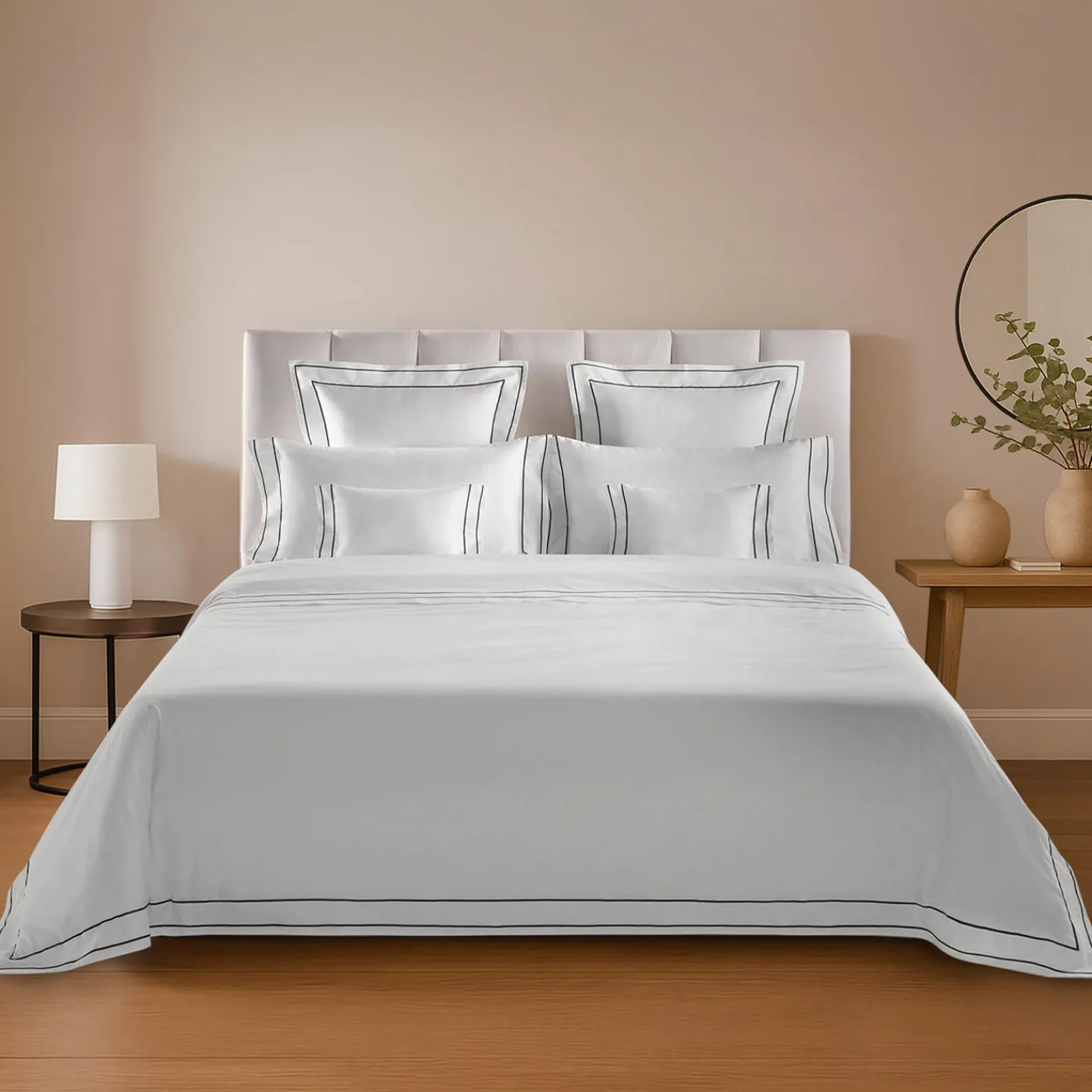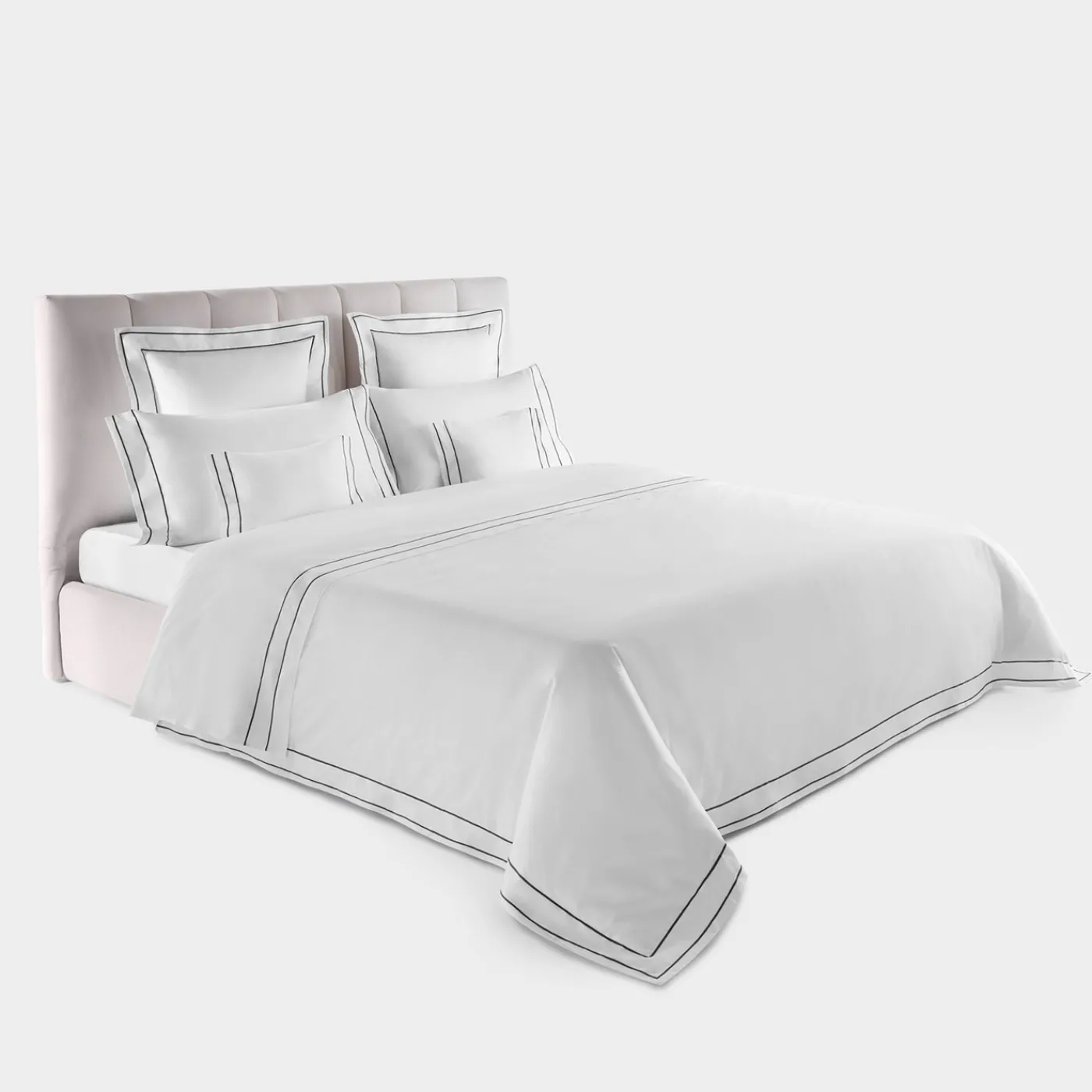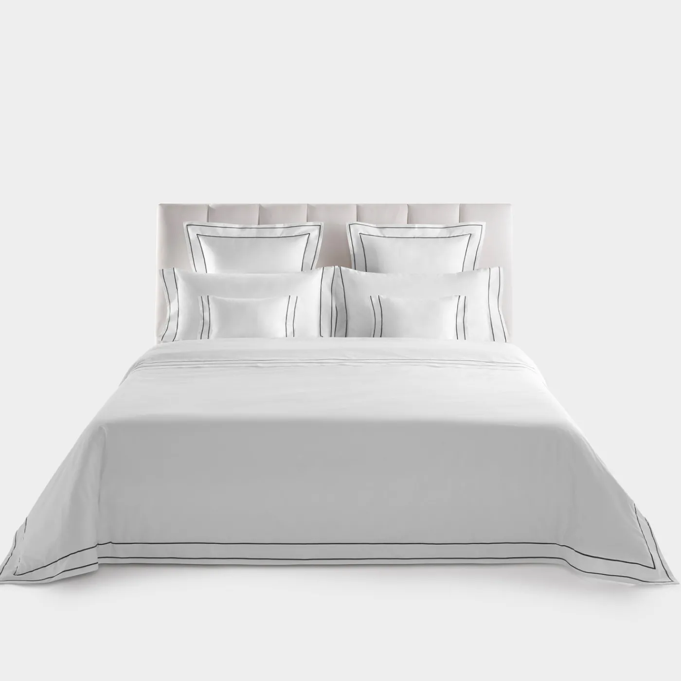 Il set Horizon in cotone bianco presenta un copripiumino di dimensione queen con bottoni, un lenzuolo con angoli e due federe. Il design è caratterizzato da un ricamo a doppia linea, che offre un sottile contrasto e un equilibrio geometrico adatto sia a interni moderni che classici. Realizzato con precisione, il set è personalizzabile in tessuto, dimensione e colore del ricamo, offrendo oltre 100 tonalità per la personalizzazione. Disponibile come set o in singoli pezzi. Per ulteriori informazioni, si prega di contattare il Concierge.