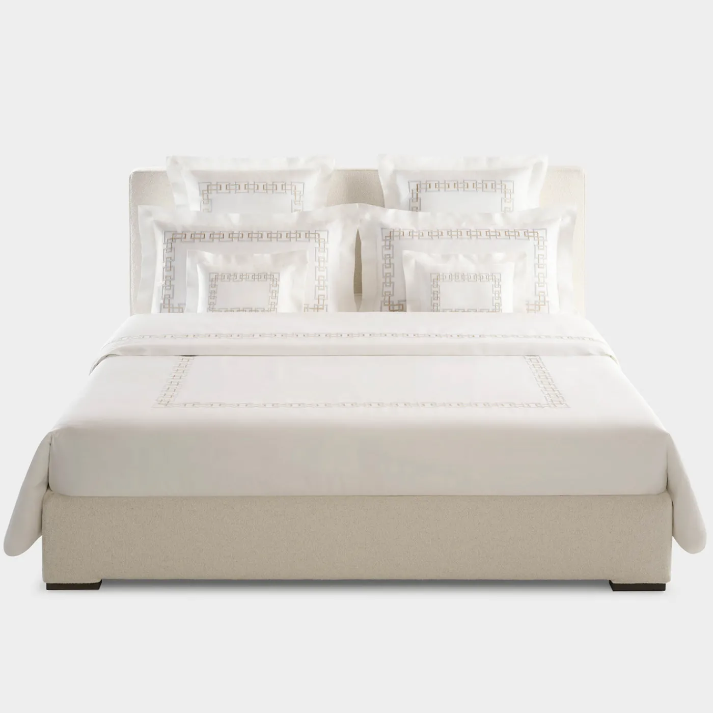 Il set di lenzuola ricamate Qena combina l’eleganza architettonica con audace ricamo geometrico che incornicia ogni pezzo in un design simmetrico. Questo set matrimoniale include un lenzuolo piano, un lenzuolo con angoli e due federe realizzate in percalle di cotone con un conteggio di 600 fili, offrendo una finitura fresca e raffinata. Le opzioni di personalizzazione includono tipo di tessuto, dimensione e colore del ricamo tra oltre 100 scelte, permettendo un lusso personalizzato. Sono disponibili accessori per la camera da letto e per il bagno coordinati. Disponibile come set o in singoli pezzi. Colore, misure e tessuto personalizzabili su richiesta. Per ulteriori informazioni, si prega di contattare il concierge.