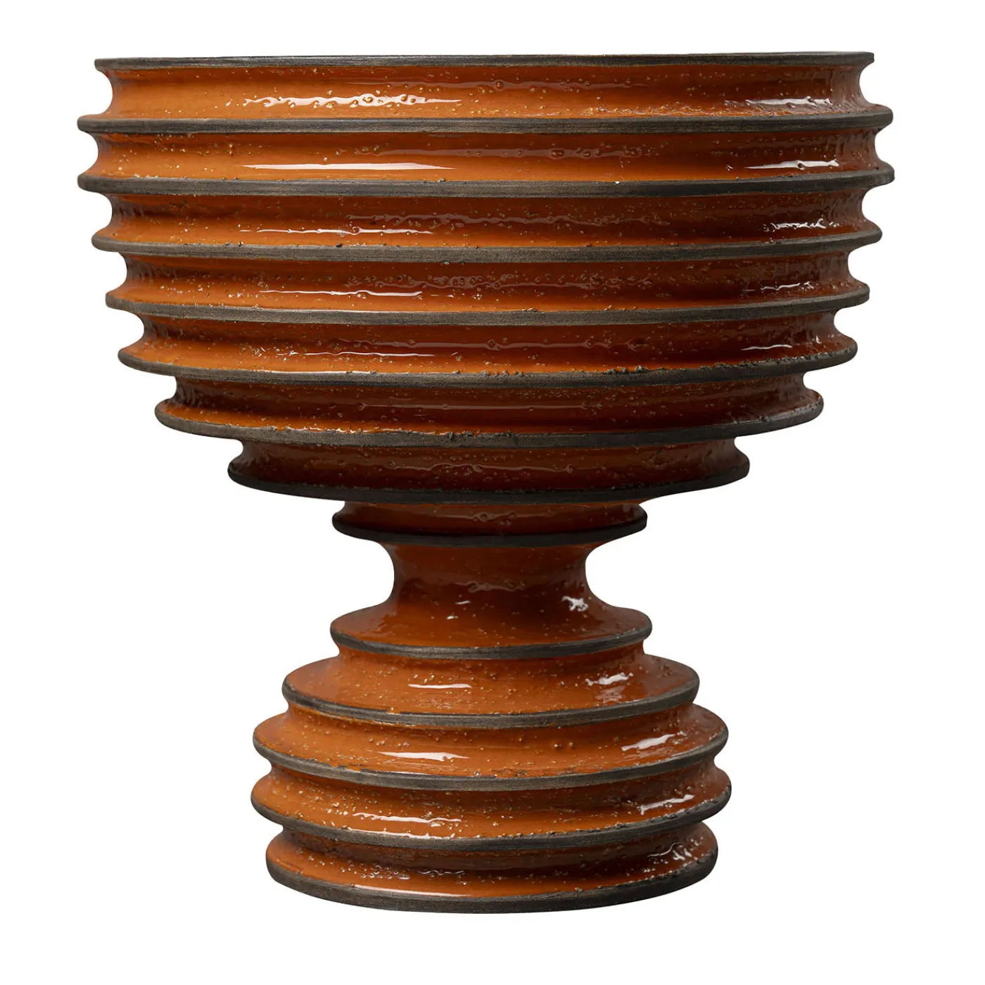 Un design tradizionale vestito con un’elegante suite contemporanea: questo calice in ceramica fa parte dell’esclusiva collezione Revolver, presentata alla Settimana del Design di Milano nel 2019. La silhouette a forma di clessidra, di colore arancione, presenta una ciotola spaziosa che poggia su una base convessa, entrambe contraddistinte da una texture a coste profonde accentuata da bordi marroni.