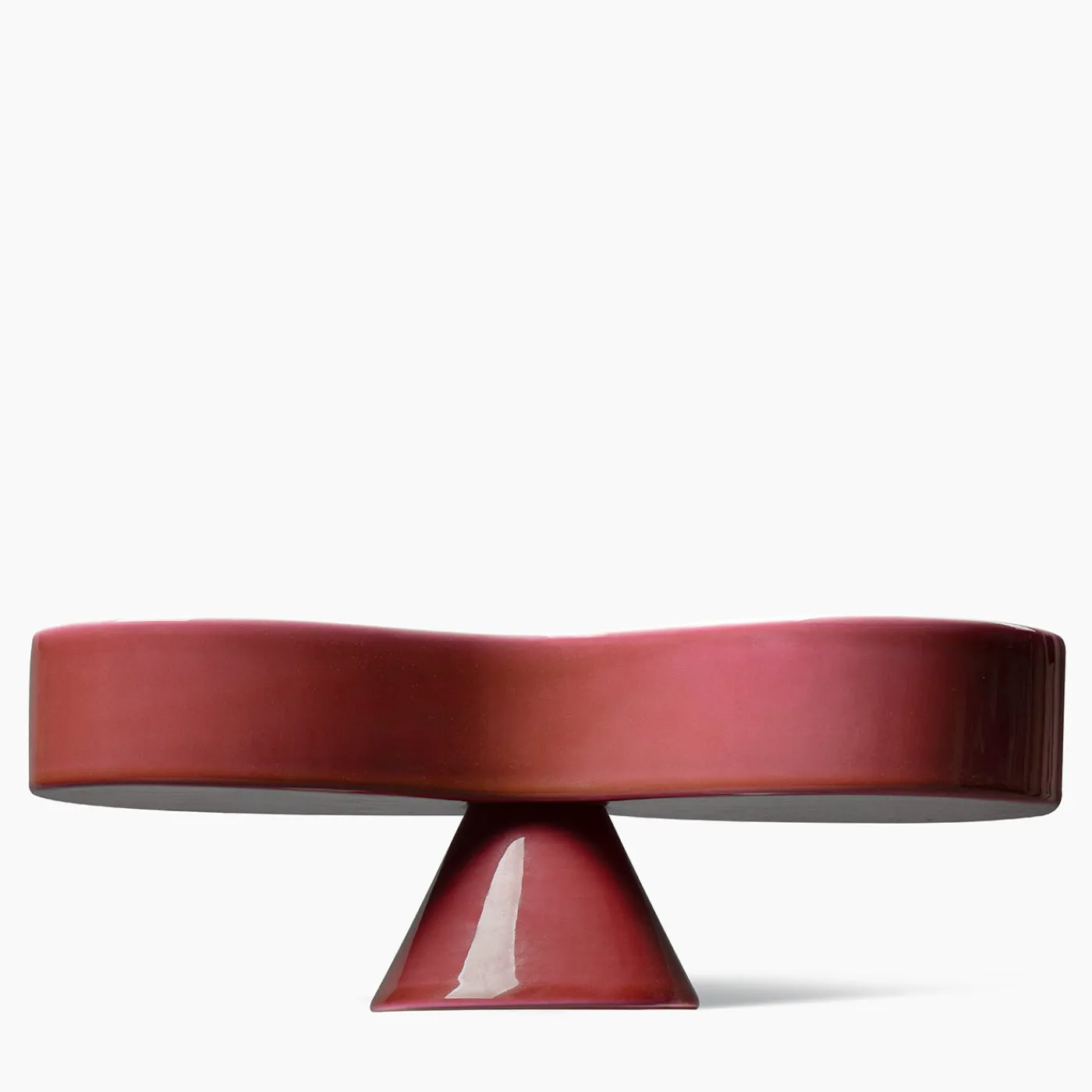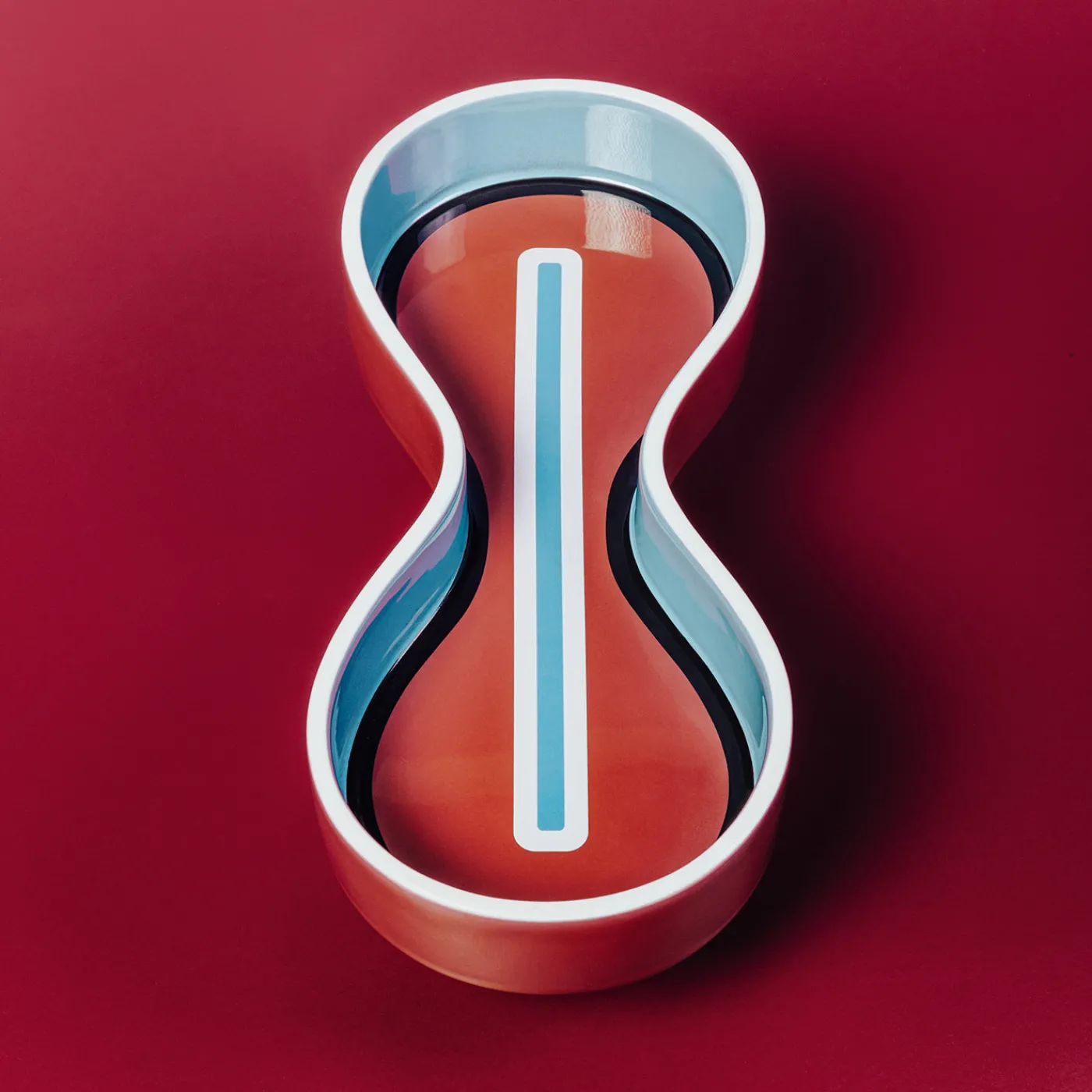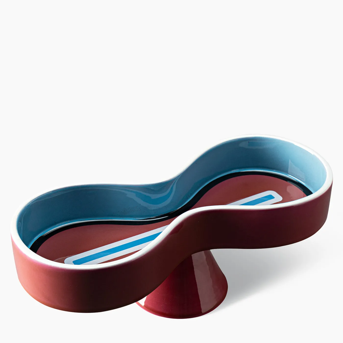 Un centro tavola in edizione limitata con un esclusivo design a forma di infinito, realizzato in argilla bianca con finitura esterna lucida color borgogna e interno turchese. Il pezzo è arricchito da un distintivo motivo decorativo centrale in blu e bianco, che crea un contrasto sorprendente. Parte della collezione Simbolik, questa scultura in ceramica si propone come elegante punto focale per gli interni moderni, ed è disponibile in soli 349 esemplari. Design di Karim Rashid.