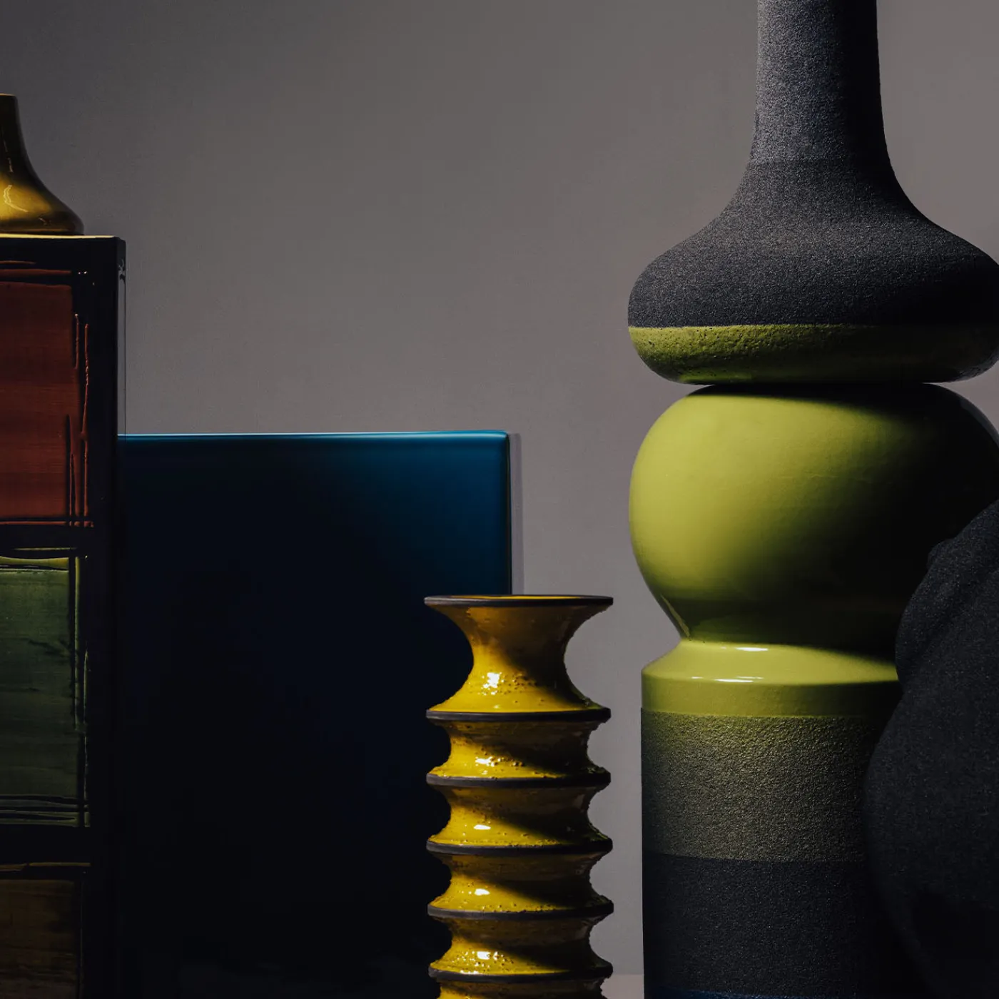 Caratterizzato da un importante profilo a coste e da una silhouette dipinta in una vivace tonalità di giallo con dettagli marroni, questo accattivante vaso decorativo appartiene alla Collezione Revolver, presentata alla Settimana del Design di Milano nel 2019. Il progressivo assottigliamento della distanza tra le nervature procede verticalmente dalla cima alla base costituendo il dettaglio eccezionale e intrigante di questo design.