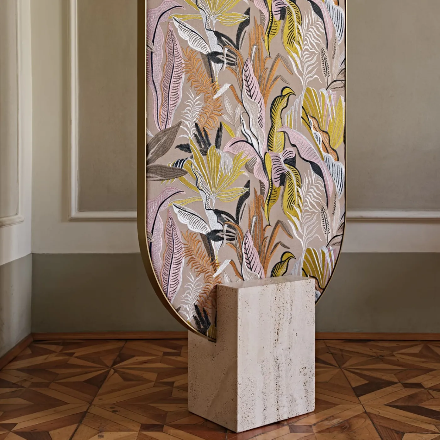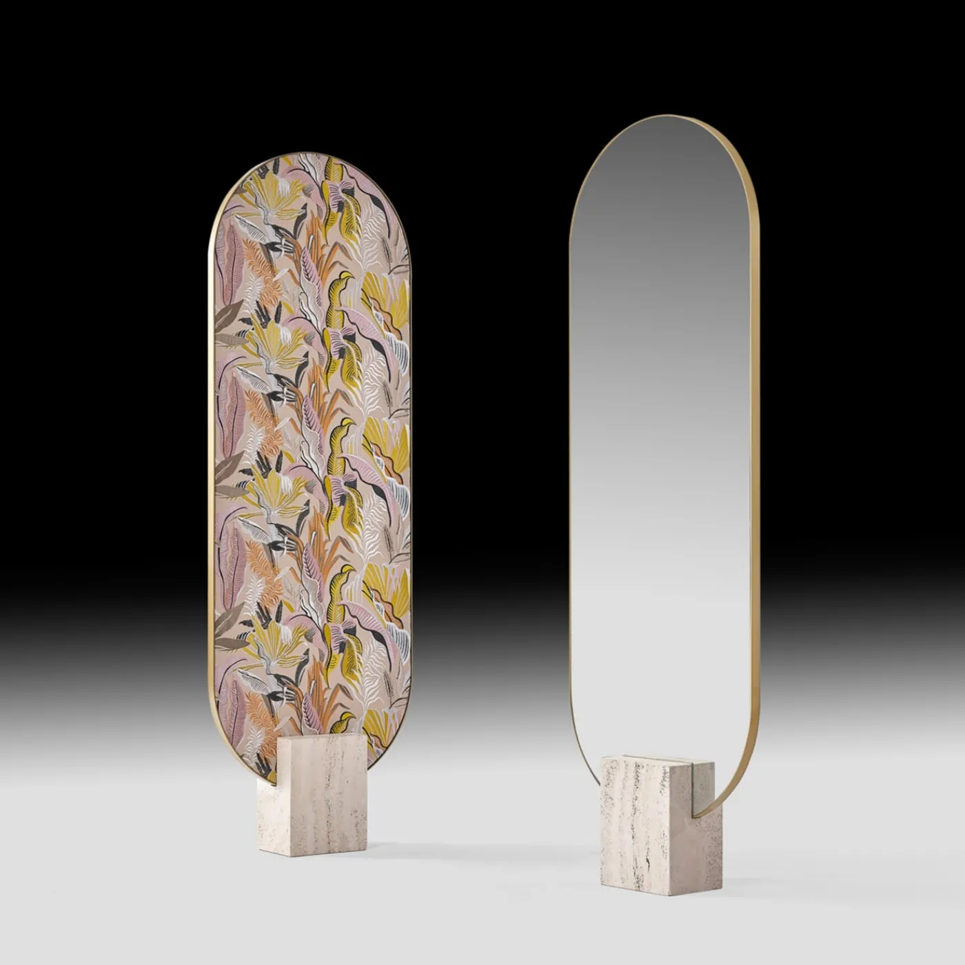 Volumi minimalisti e preziosi dettagli sartoriali si uniscono per conferire a questo moderno specchio freestanding un fascino glamour. Montato su un audace blocco di travertino a poro aperto che funge da base scultorea, il vetro specchiato extrachiaro, definito da estremità arrotondate, è incastonato in una cornice di metallo dorato opaco, accoppiata a un sottile pannello di compensato per una perfetta sintesi di stabilità e leggerezza. Esplorate le varianti disponibili con il Concierge.