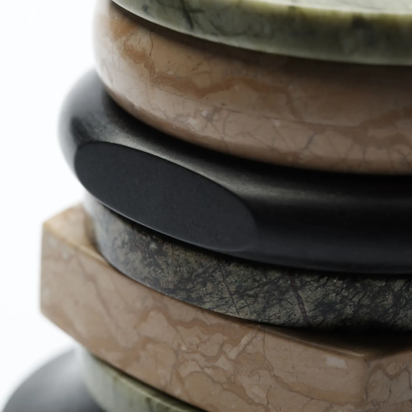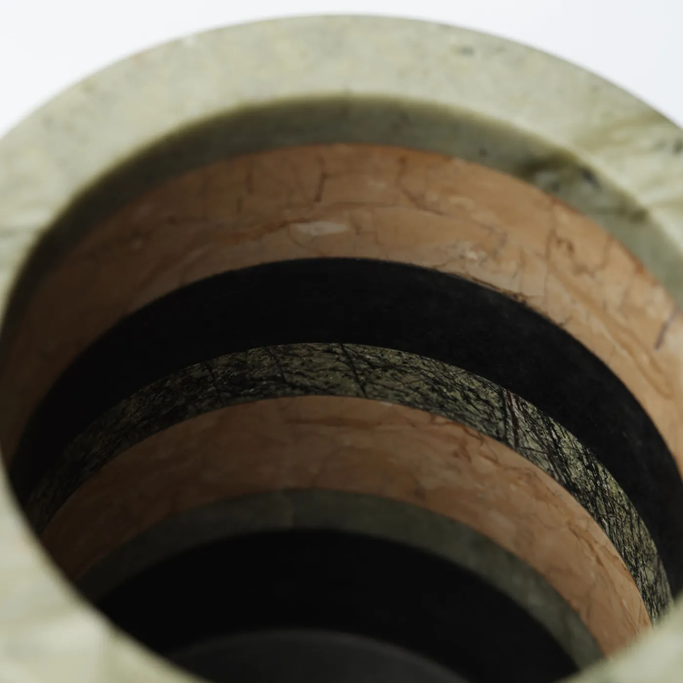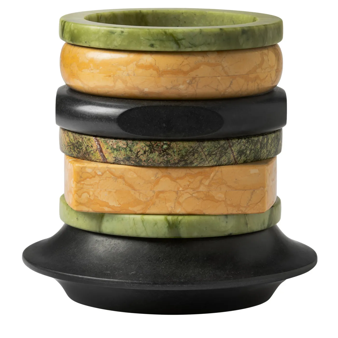 Un bracciale in marmo nero funge da base per questo splendido e originale vaso in marmo della Bangle Collection della designer Cristina Celestino, una collezione speciale creata da bracciali in marmo impilati tra loro. I braccialetti di marmo arancione, verde e screziato si fondono per formare il corpo di questo splendido pezzo.